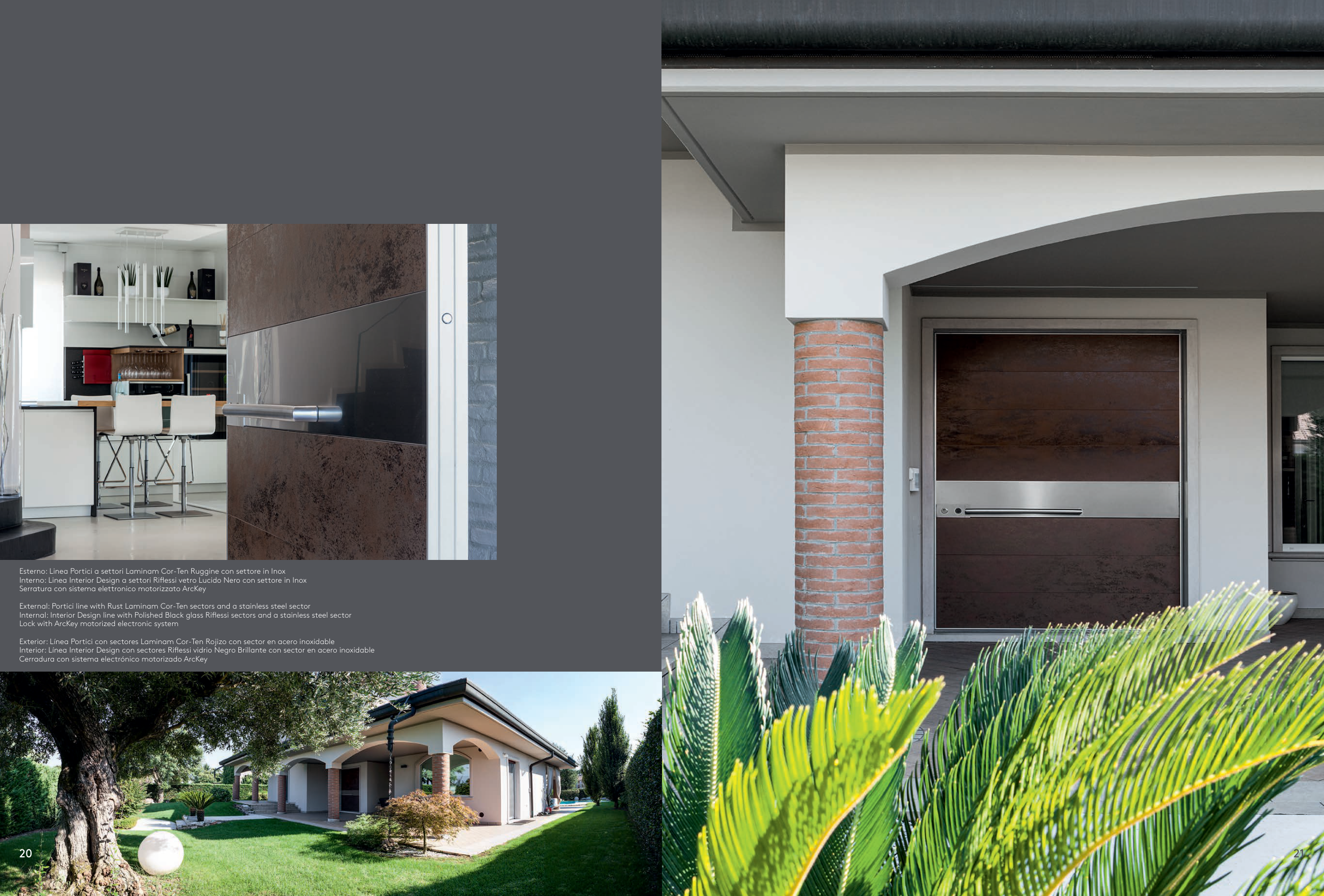 Exterior: Línea Portici con sectores Laminam Cor-Ten Rojizo con sector en acero inoxidable