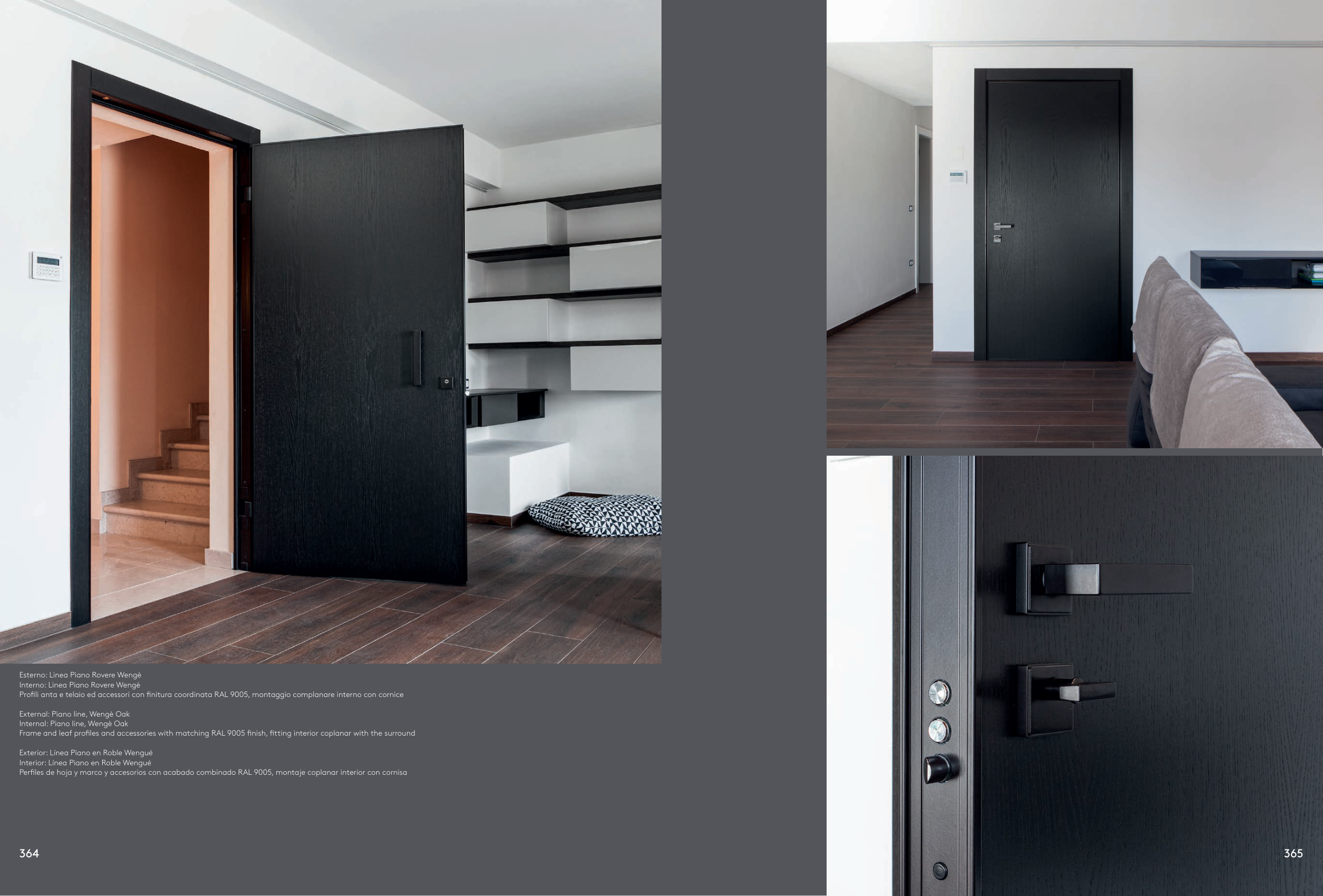 Frame and leaf profiles and accessories with matching RAL 9005 finish, fitting interior coplanar with the surround