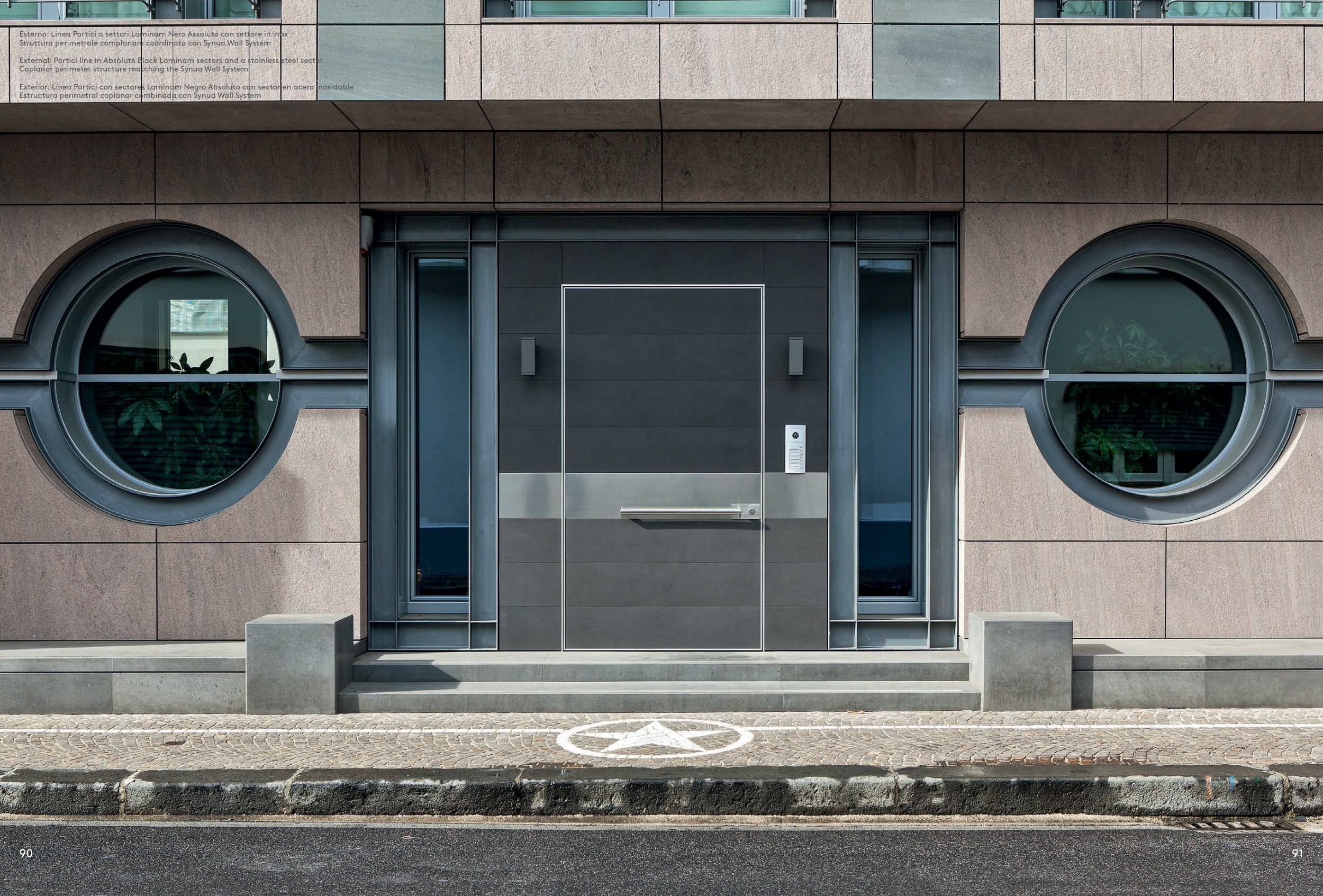 External: Portici line in Absolute Black Laminam sectors and a stainless steel sector