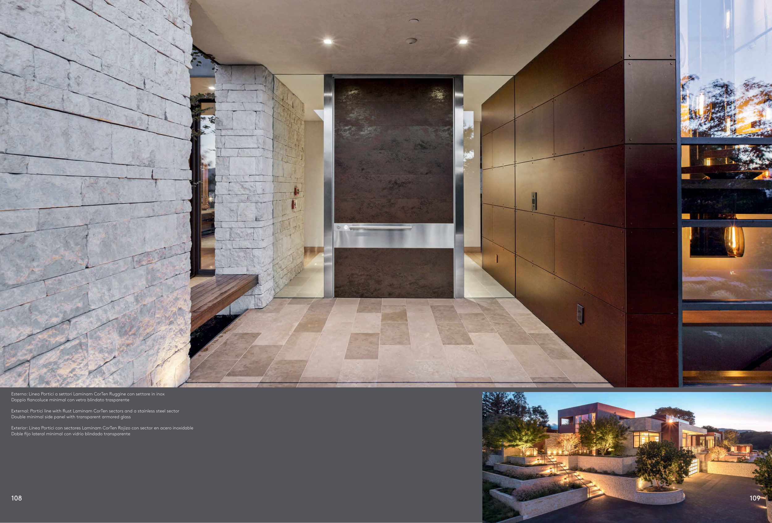 Exterior: Línea Portici con sectores Laminam CorTen Rojizo con sector en acero inoxidable