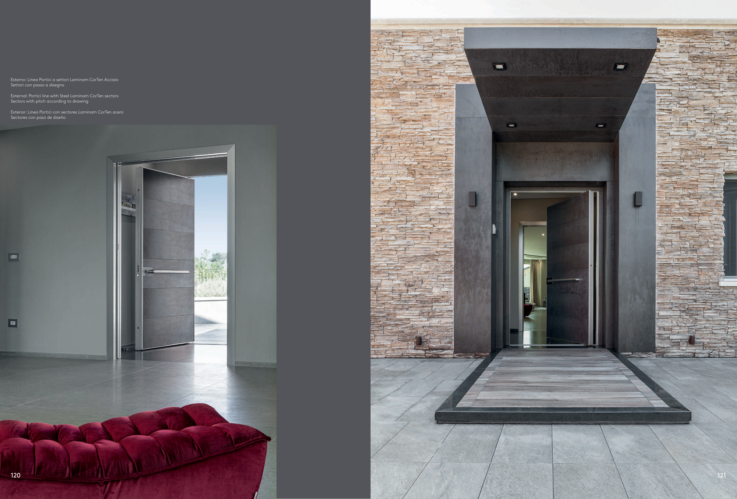 Exterior: Línea Portici con sectores Laminam CorTen acero