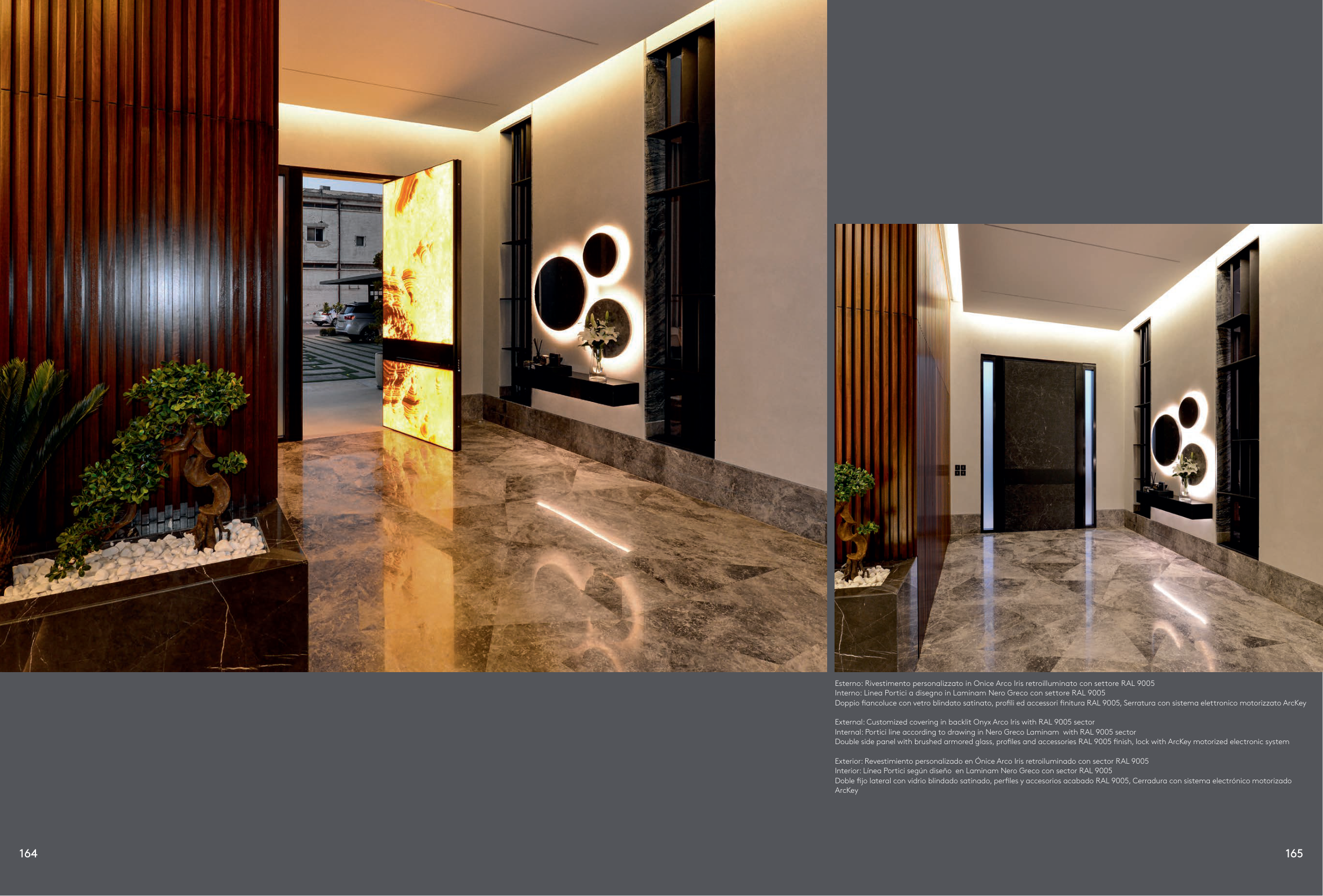 External: Customized covering in backlit Onyx Arco Iris with RAL 9005 sector