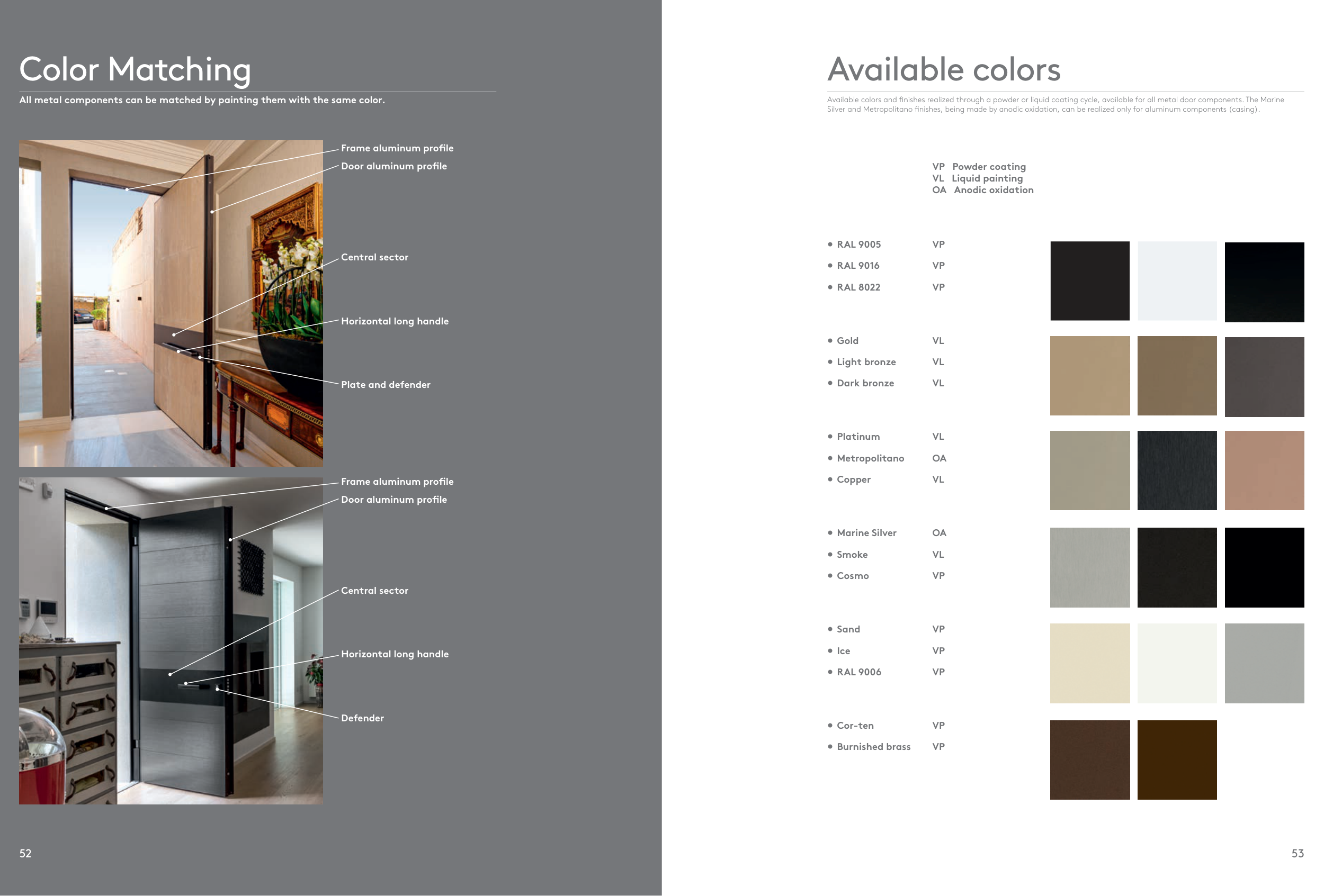 Available colors and fi nishes realized through a powder or liquid coating cycle, available for all metal door components. The Marine
