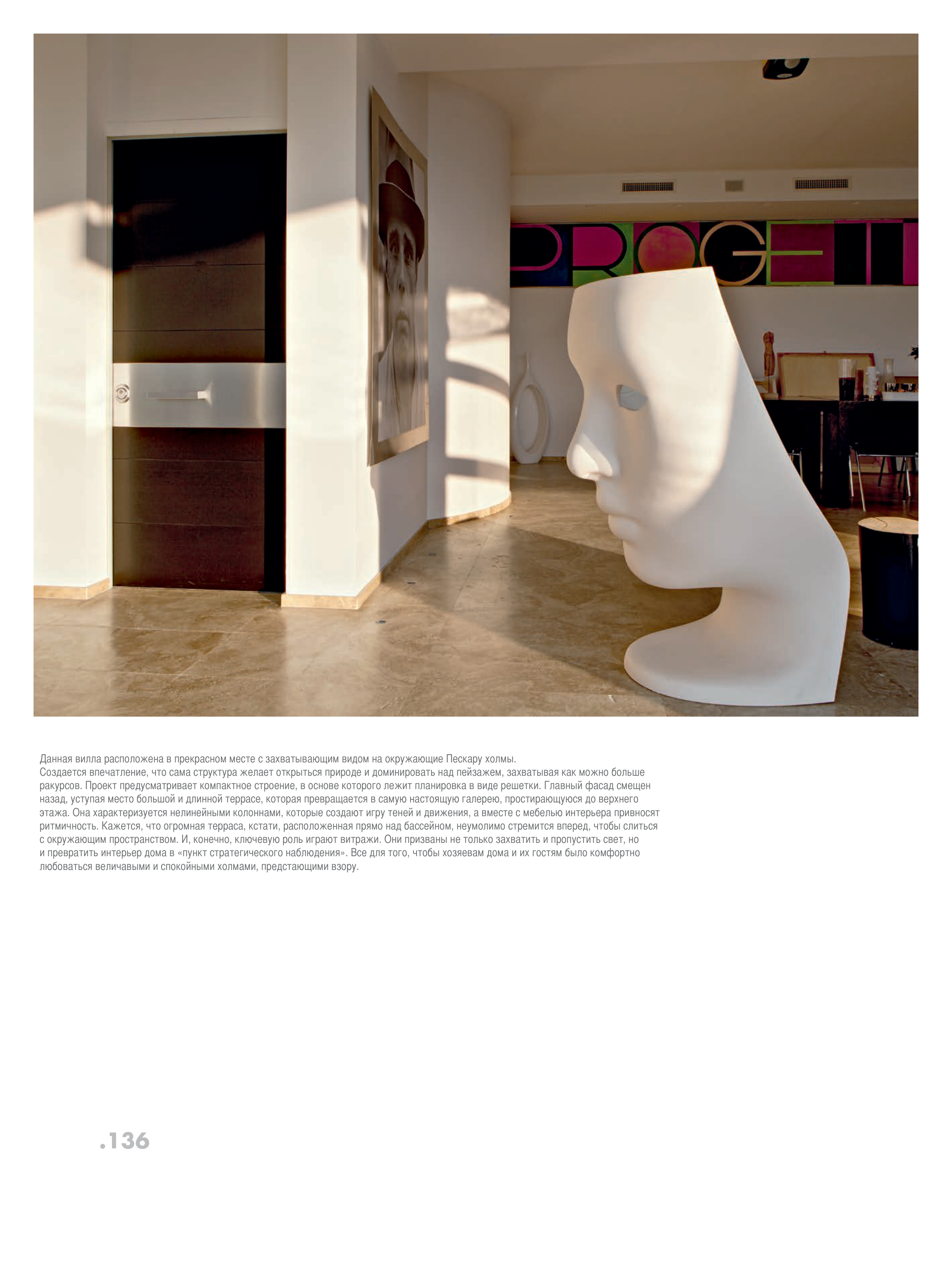 этажа. Она характеризуется нелинейными колоннами, которые создают игру теней и движения, а вместе с мебелью интерьера привносят