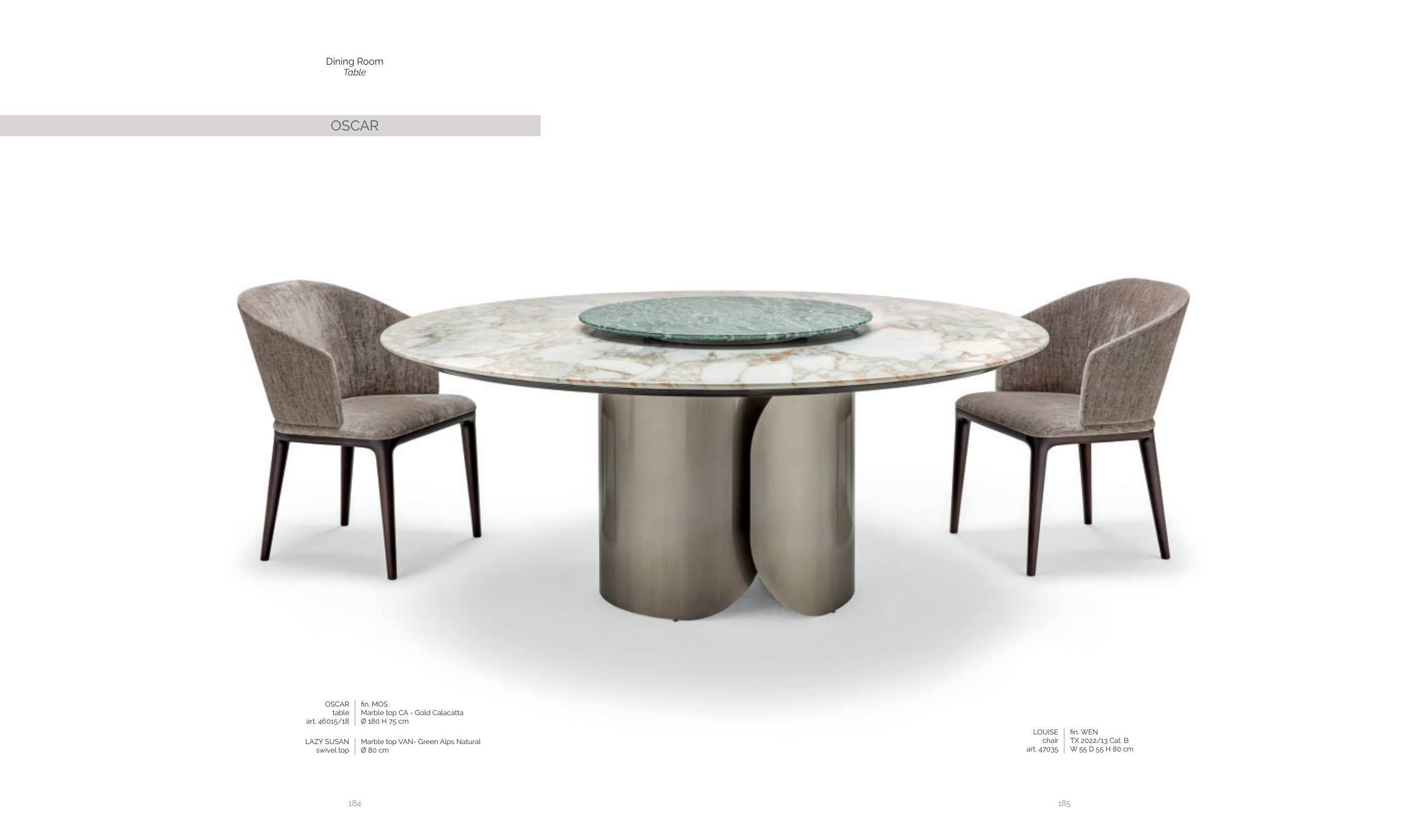 OSCAR fi n. MOS Marble top CA - Gold Calacatta Ø 180 H 75 cm OSCAR table art. 46015/18 Marble top VAN- Green Alps Natural Ø 80 cm LAZY SUSAN swivel top fi n. WEN TX 2022/13 Cat. B W 55 D 55 H 80 cm LOUISE chair art. 47035 Dining Room Table OSCAR 184 185