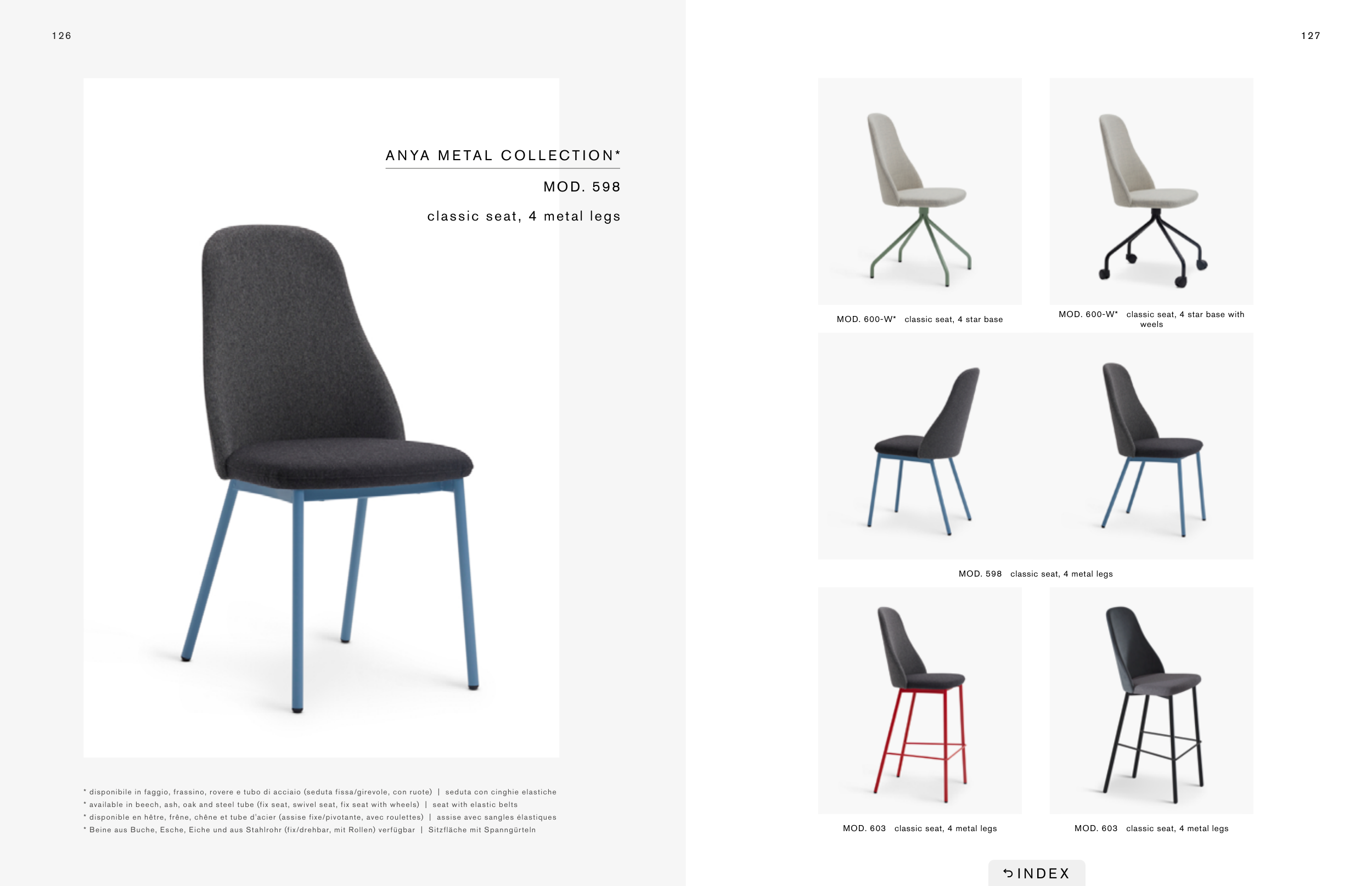 * disponible en hêtre, frêne, chêne et tube d'acier (assise fixe/pivotante, avec roulettes) | assise avec sangles élastiques
