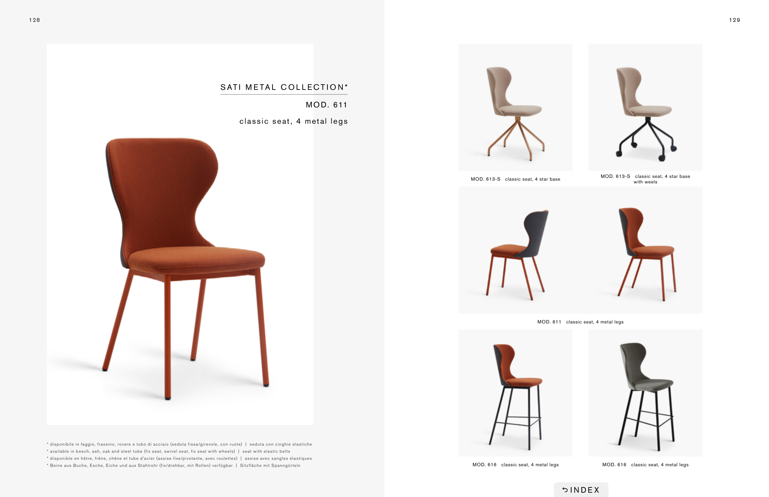 * disponible en hêtre, frêne, chêne et tube d'acier (assise fixe/pivotante, avec roulettes) | assise avec sangles élastiques