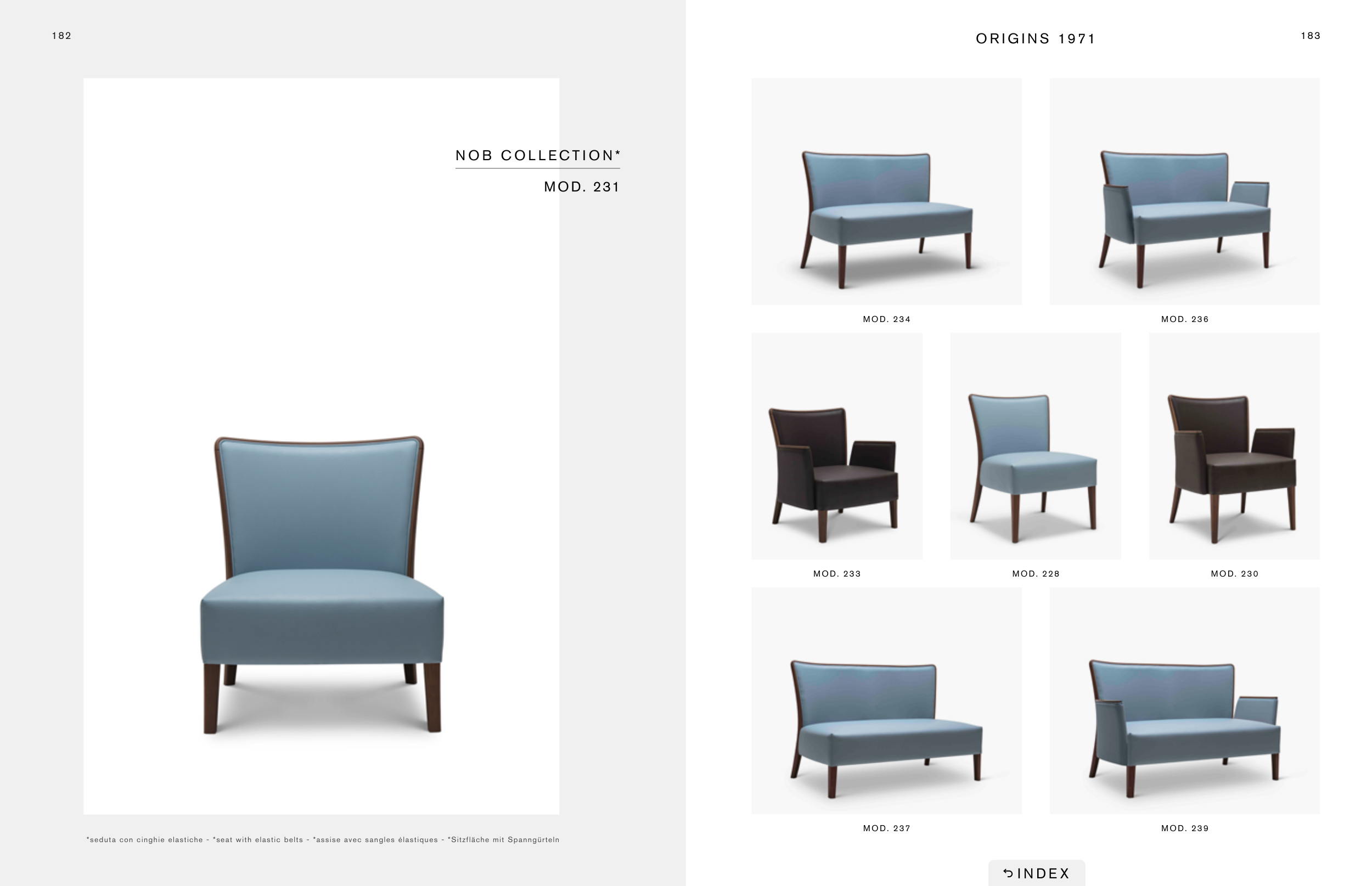 183 182 O R I G I N S 1971 MOD. 237 MOD. 233 MOD. 228 MOD. 230 MOD. 236 MOD. 239 N O B C O L L E C T I O N * MOD. 231 MOD. 234 *seduta con cinghie elastiche - *seat with elastic belts - *assise avec sangles élastiques - *Sitzfläche mit Spanngürteln I N D E X
