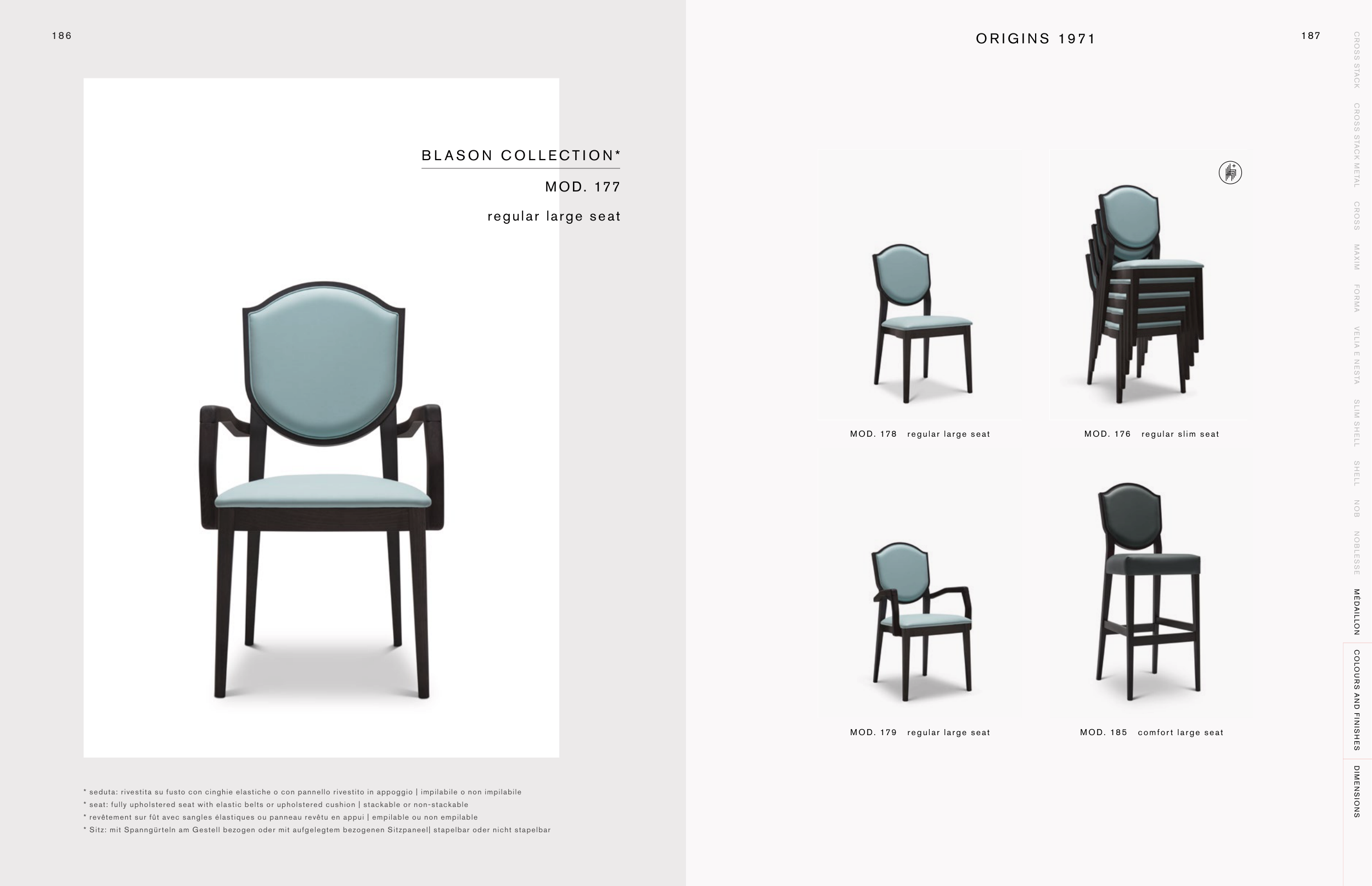 * seat: fully upholstered seat with elastic belts or upholstered cushion | stackable or non-stackable