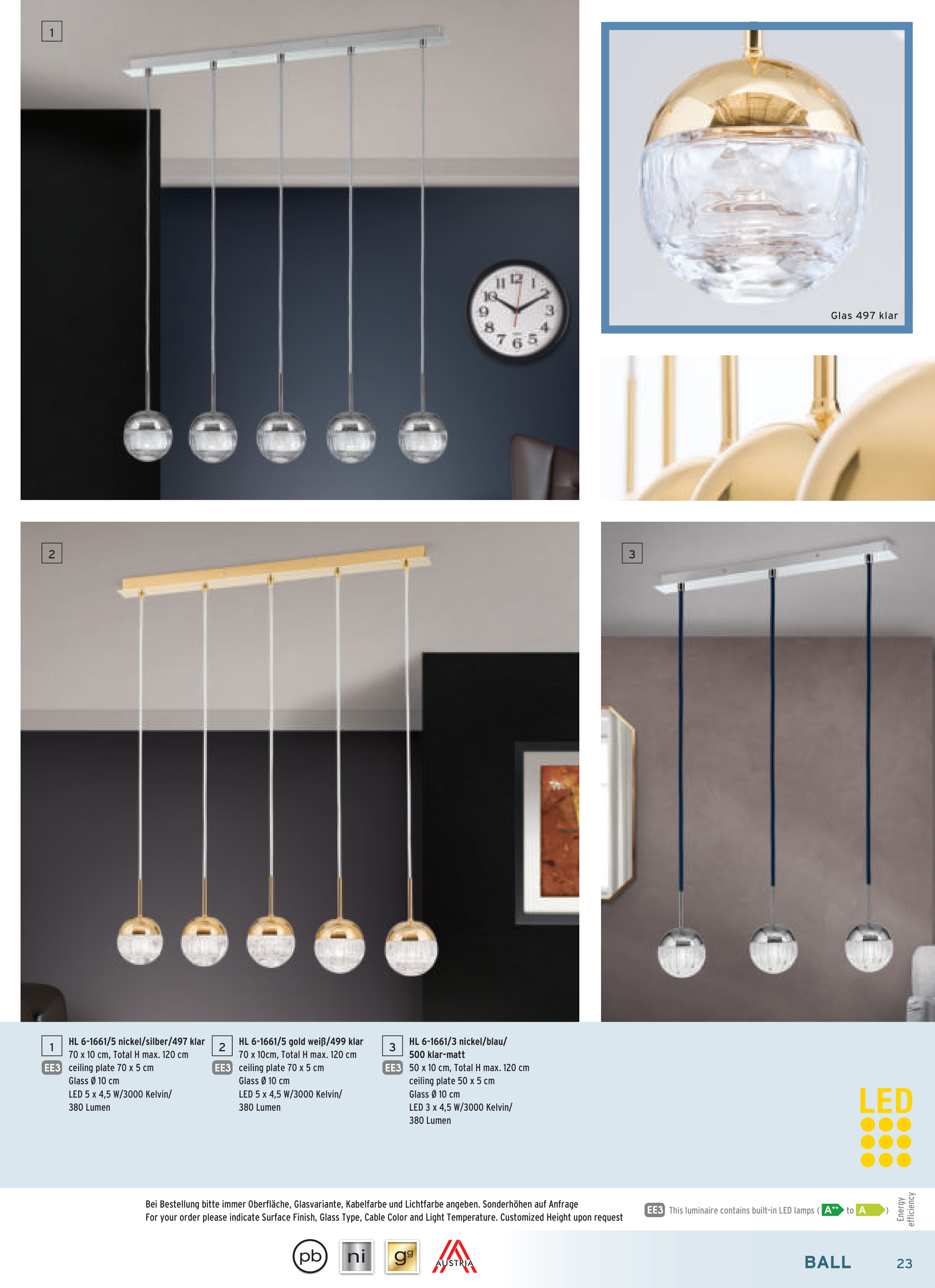 Bei Bestellung bitte immer Oberfläche, Glasvariante, Kabelfarbe und Lichtfarbe angeben. Sonderhöhen auf Anfrage