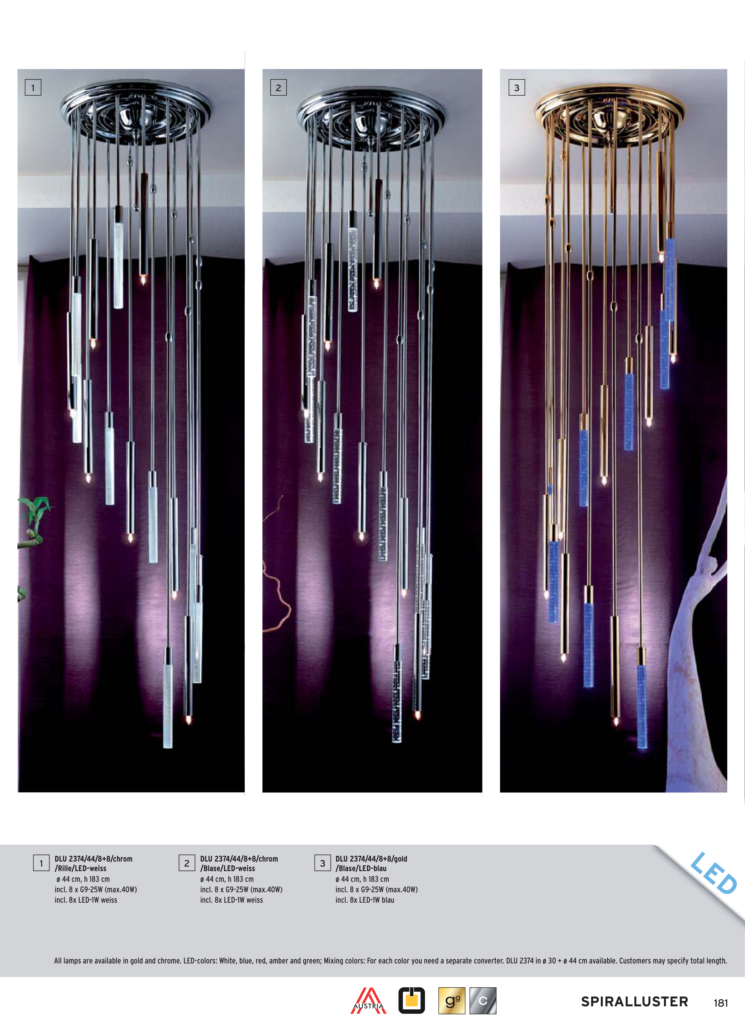 All lamps are available in gold and chrome. LED-colors: White, blue, red, amber and green; Mixing colors: For each color you need a separate converter. DLU 2374 in ø 30 + ø 44 cm available. Customers may specify total length.