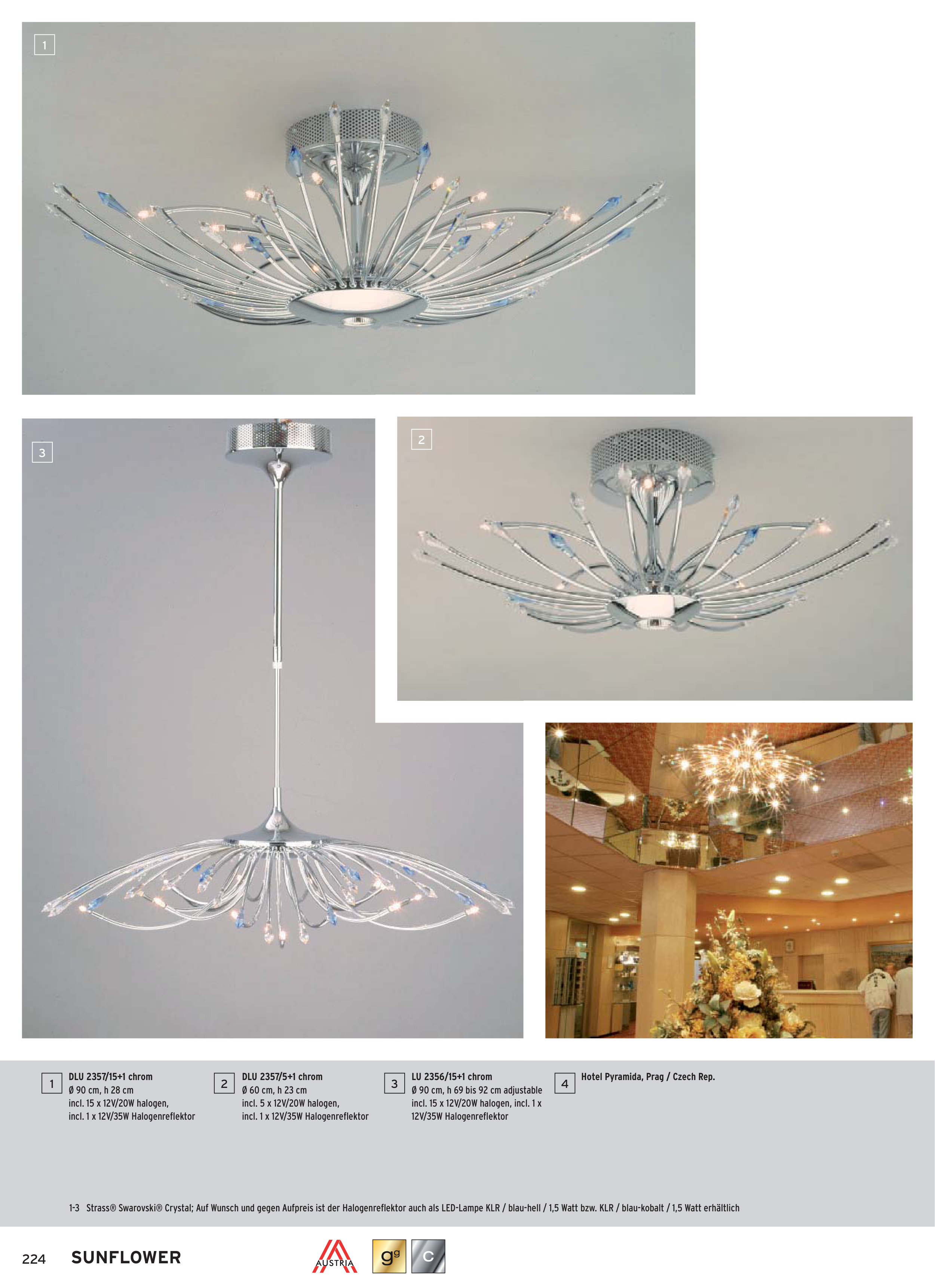 1-3 Strass® Swarovski® Crystal; Auf Wunsch und gegen Aufpreis ist der Halogenrefl ektor auch als LED-Lampe KLR / blau-hell / 1,5 Watt bzw. KLR / blau-kobalt / 1,5 Watt erhältlich