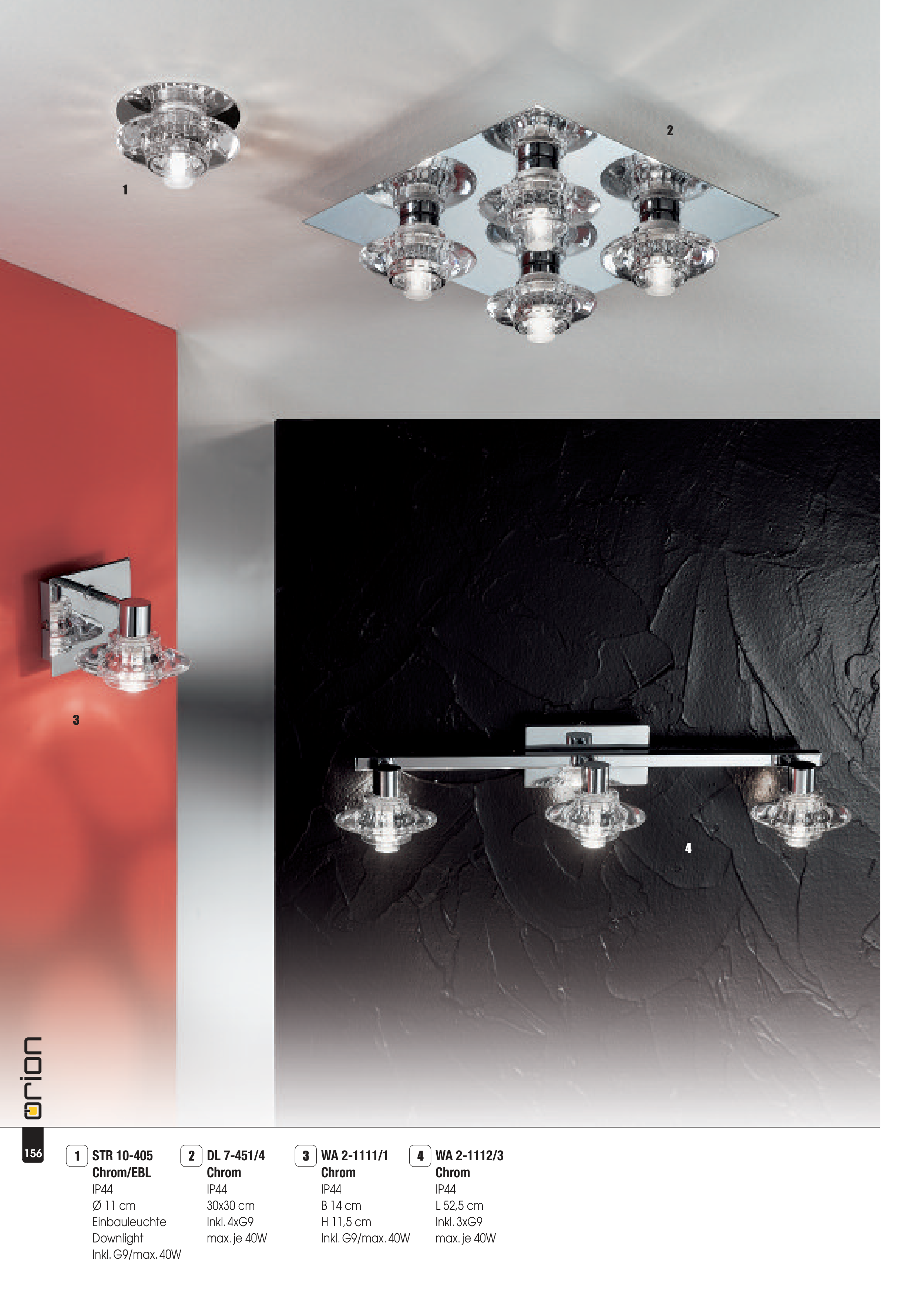 1 2 3 4 WA 2-1112/3 Chrom IP44 L 52,5 cm Inkl. 3xG9 max. je 40W 4 WA 2-1111/1 Chrom IP44 B 14 cm H 11,5 cm Inkl. G9/max. 40W 3 DL 7-451/4 Chrom IP44 30x30 cm Inkl. 4xG9 max. je 40W 2 STR 10-405 Chrom/EBL IP44 Ø 11 cm Einbauleuchte Downlight Inkl. G9/max. 40W 1 156