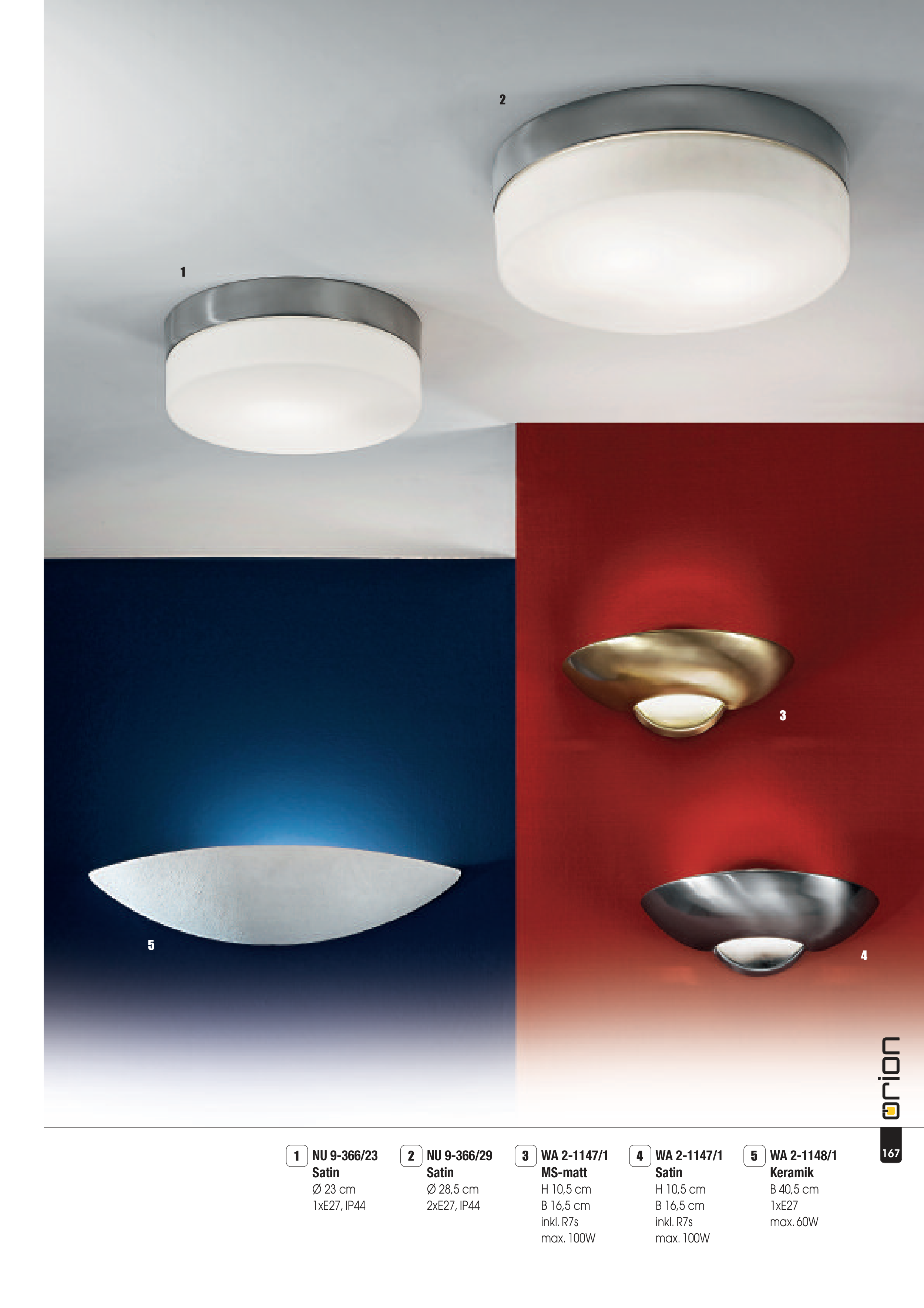 1 2 5 3 4 167 NU 9-366/23 Satin Ø 23 cm 1xE27, IP44 1 NU 9-366/29 Satin Ø 28,5 cm 2xE27, IP44 2 WA 2-1147/1 MS-matt H 10,5 cm B 16,5 cm inkl. R7s max. 100W 3 WA 2-1147/1 Satin H 10,5 cm B 16,5 cm inkl. R7s max. 100W 4 WA 2-1148/1 Keramik B 40,5 cm 1xE27 max. 60W 5