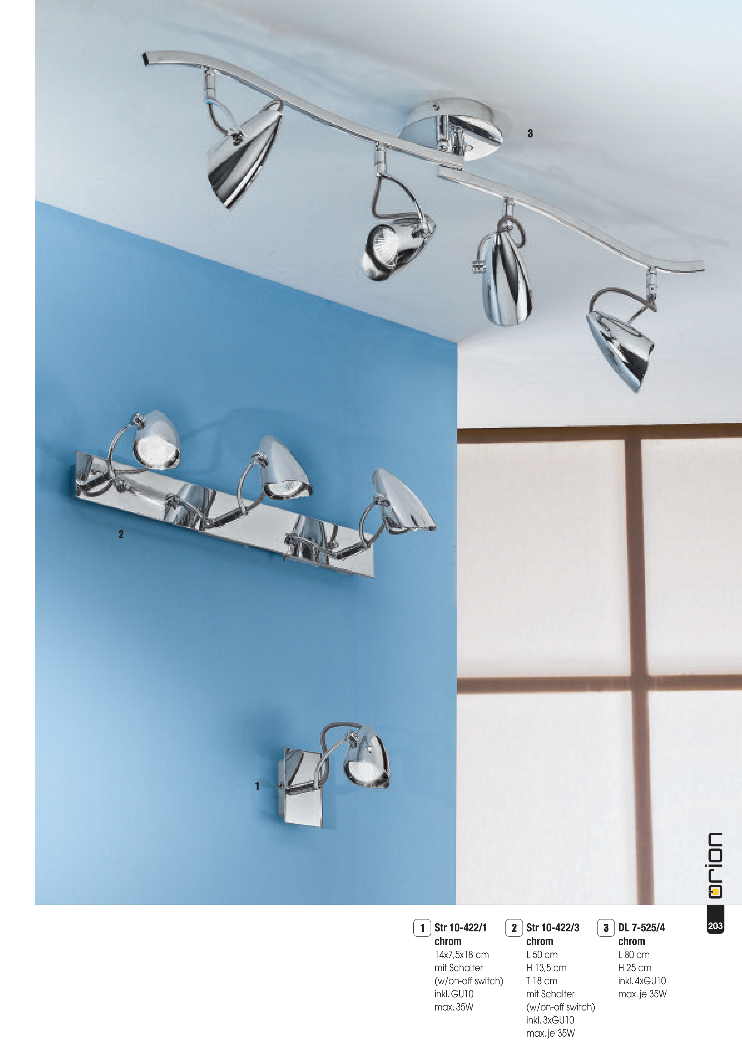 DL 7-525/4 chrom L 80 cm H 25 cm inkl. 4xGU10 max. je 35W 3 Str 10-422/3 chrom L 50 cm H 13,5 cm T 18 cm mit Schalter (w/on-off switch) inkl. 3xGU10 max. je 35W 2 Str 10-422/1 chrom 14x7,5x18 cm mit Schalter (w/on-off switch) inkl. GU10 max. 35W 1 203 3 2 1