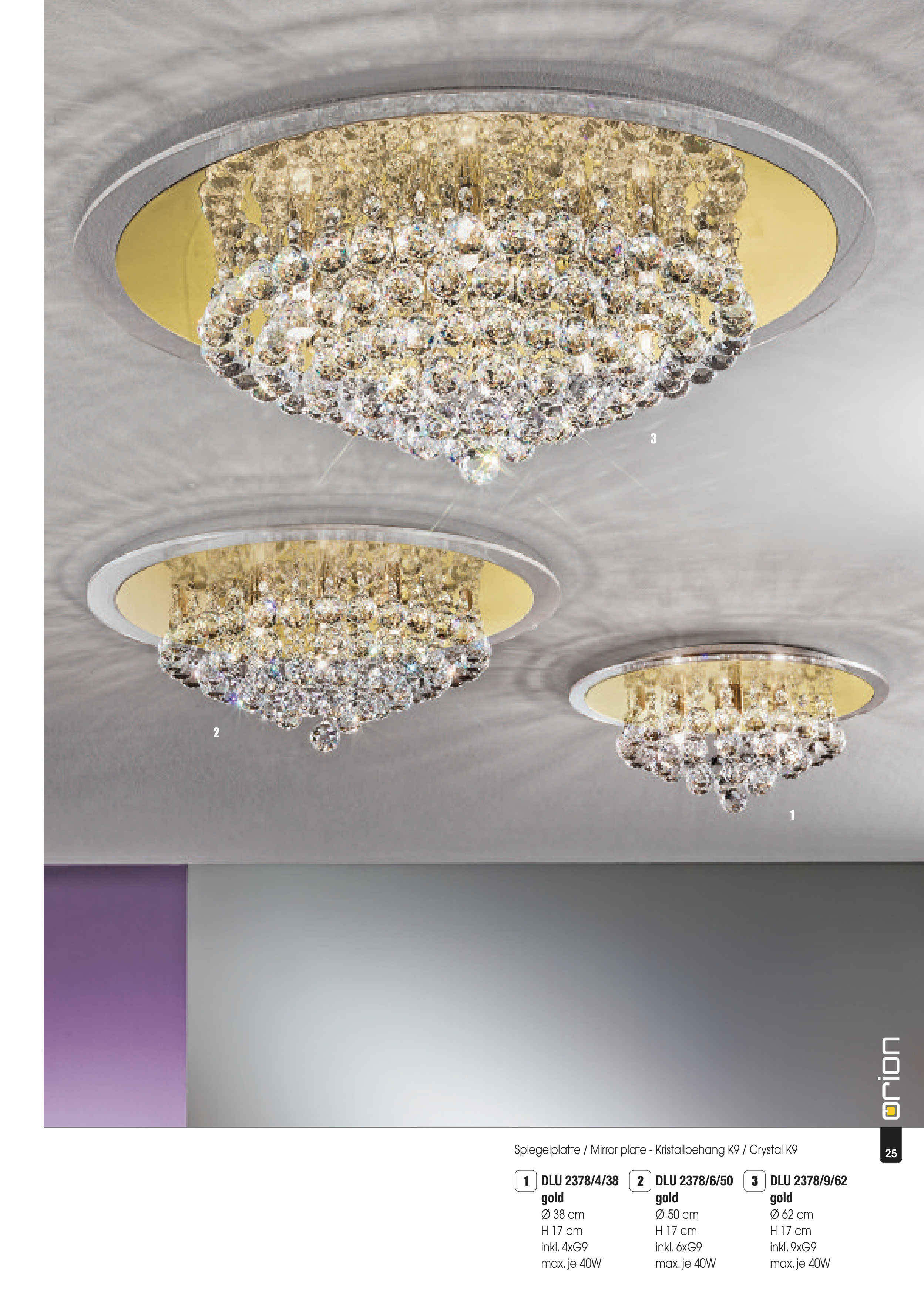 DLU 2378/9/62 gold Ø 62 cm H 17 cm inkl. 9xG9 max. je 40W 3 DLU 2378/6/50 gold Ø 50 cm H 17 cm inkl. 6xG9 max. je 40W 2 DLU 2378/4/38 gold Ø 38 cm H 17 cm inkl. 4xG9 max. je 40W 1 25 Spiegelplatte / Mirror plate - Kristallbehang K9 / Crystal K9 3 2 1