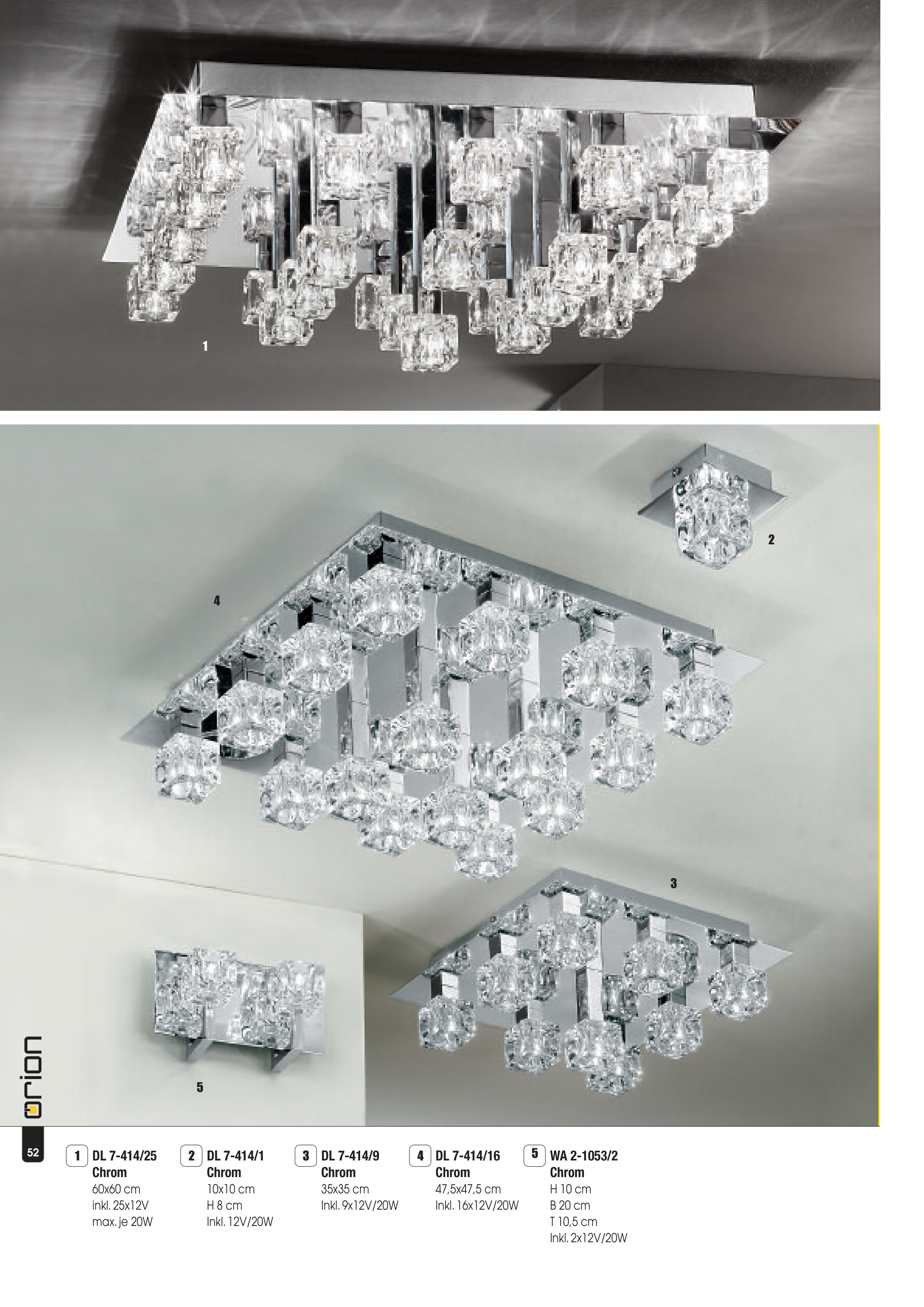 1 4 2 3 5 52 DL 7-414/16 Chrom 47,5x47,5 cm Inkl. 16x12V/20W 4 WA 2-1053/2 Chrom H 10 cm B 20 cm T 10,5 cm Inkl. 2x12V/20W 5 DL 7-414/9 Chrom 35x35 cm Inkl. 9x12V/20W 3 DL 7-414/1 Chrom 10x10 cm H 8 cm Inkl. 12V/20W 2 DL 7-414/25 Chrom 60x60 cm inkl. 25x12V max. je 20W 1