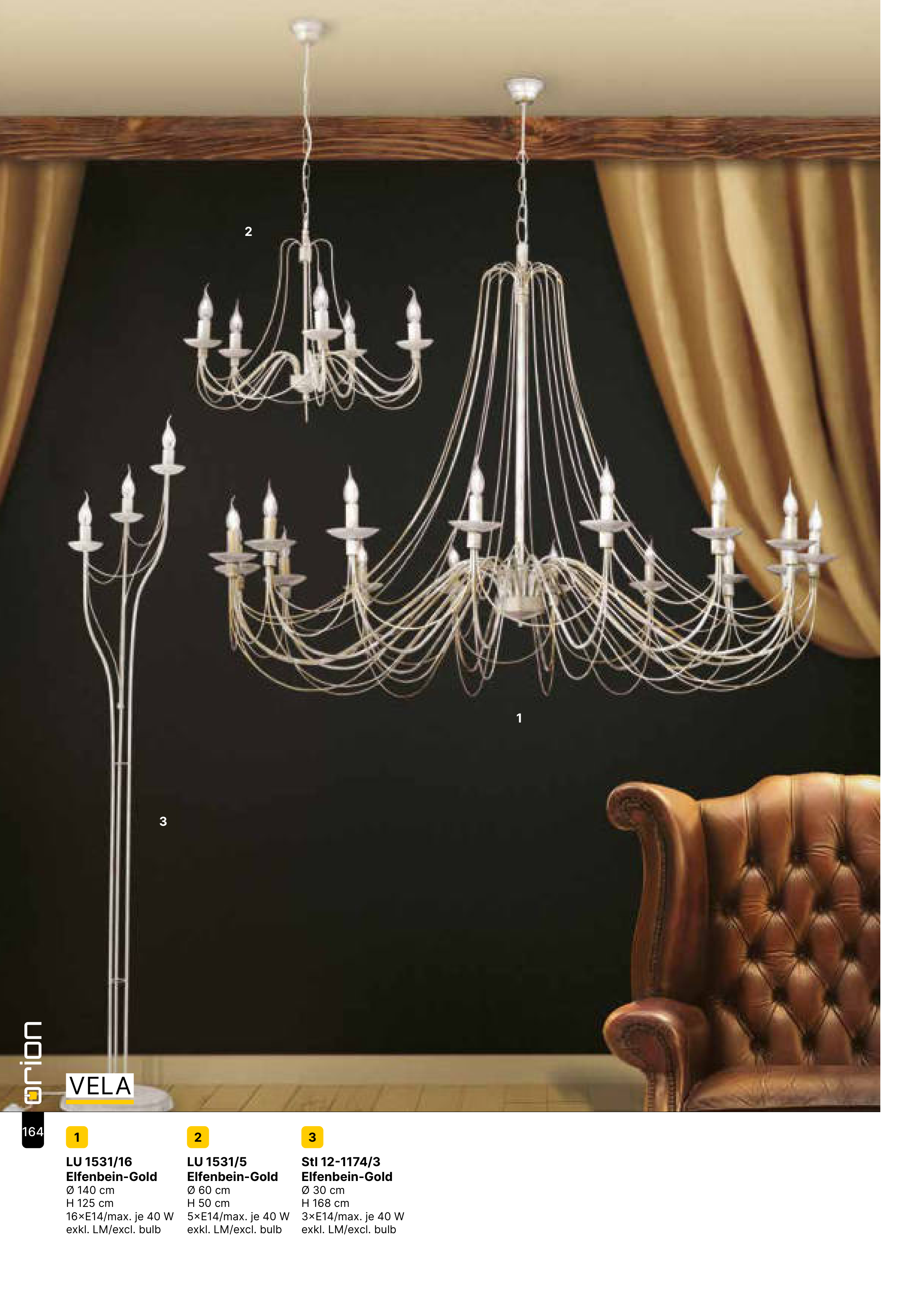 1 3 2 1 LU 1531/16 Elfenbein-Gold Ø 140 cm H 125 cm 16×E14/max. je 40 W exkl. LM/excl. bulb 2 LU 1531/5 Elfenbein-Gold Ø 60 cm H 50 cm 5×E14/max. je 40 W exkl. LM/excl. bulb 3 Stl 12-1174/3 Elfenbein-Gold Ø 30 cm H 168 cm 3×E14/max. je 40 W exkl. LM/excl. bulb VELA 164