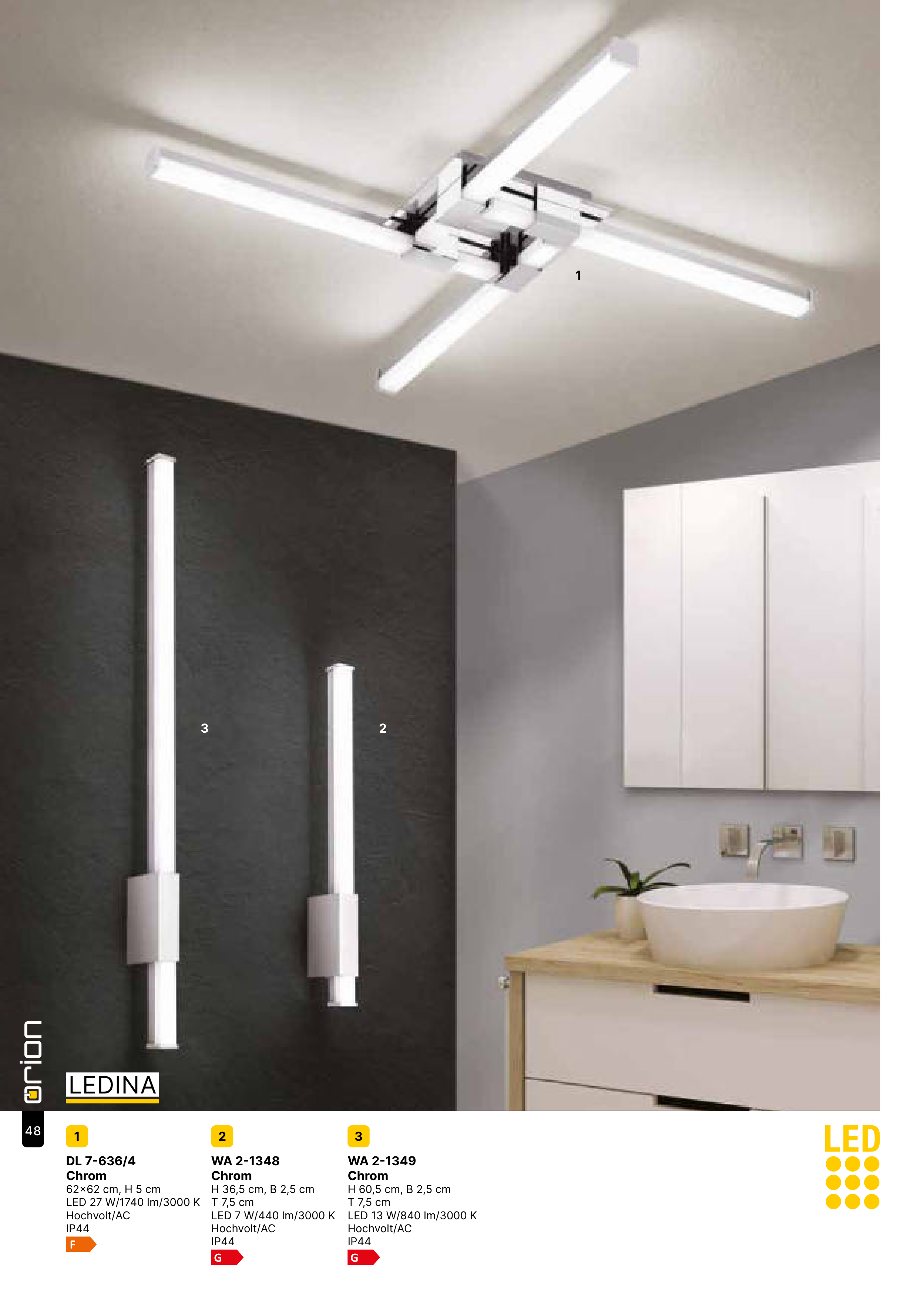 LEDINA 1 2 3 1 DL 7-636/4 Chrom 62x62 cm, H 5 cm LED 27 W/1740 lm/3000 K Hochvolt/AC IP44 2 WA 2-1348 Chrom H 36,5 cm, B 2,5 cm T 7,5 cm LED 7 W/440 lm/3000 K Hochvolt/AC IP44 3 WA 2-1349 Chrom H 60,5 cm, B 2,5 cm T 7,5 cm LED 13 W/840 lm/3000 K Hochvolt/AC IP44 48
