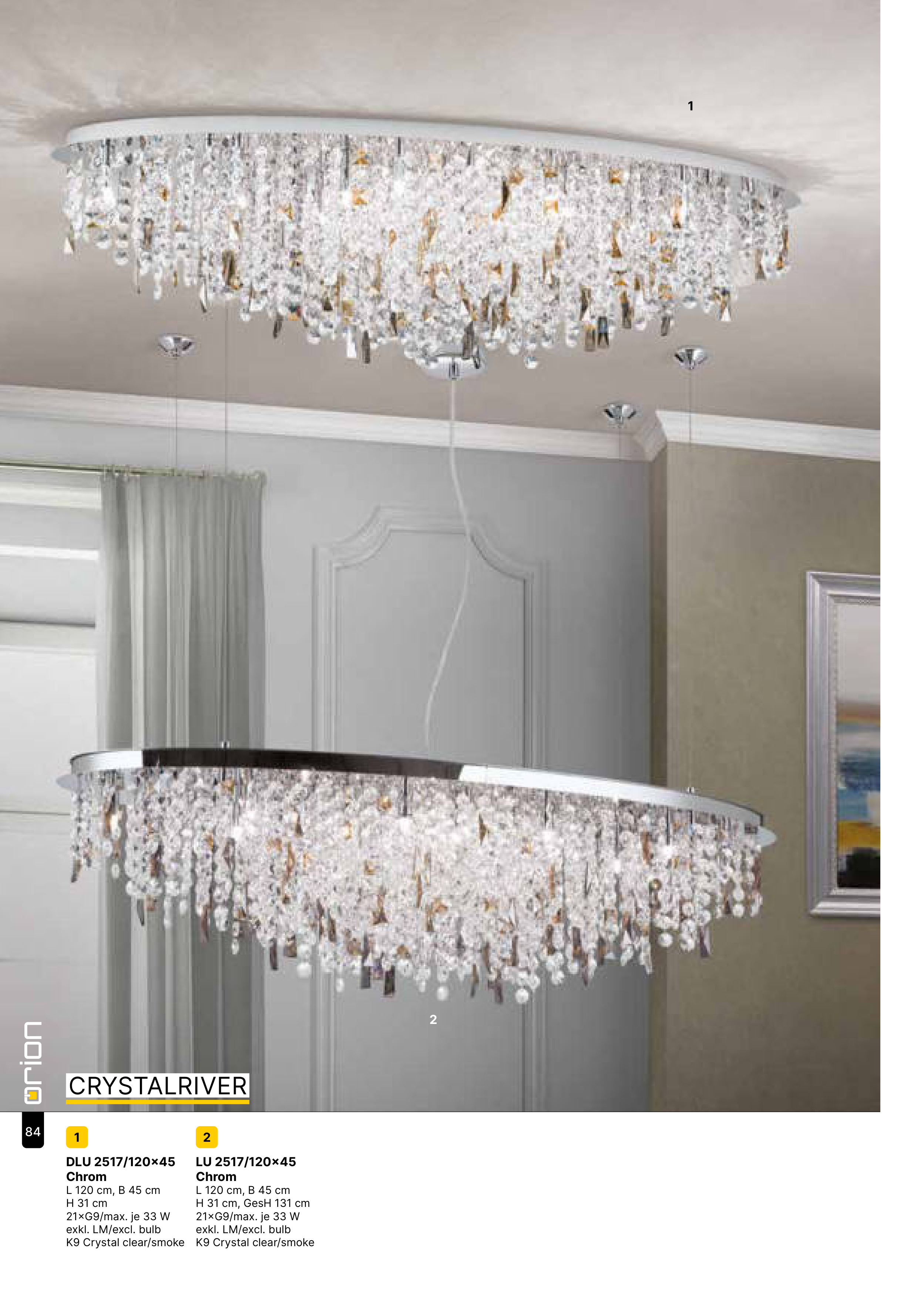 2 LU 2517/120x45 Chrom L 120 cm, B 45 cm H 31 cm, GesH 131 cm 21xG9/max. je 33 W exkl. LM/excl. bulb K9 Crystal clear/smoke 1 DLU 2517/120x45 Chrom L 120 cm, B 45 cm H 31 cm 21xG9/max. je 33 W exkl. LM/excl. bulb K9 Crystal clear/smoke 1 2 CRYSTALRIVER 84