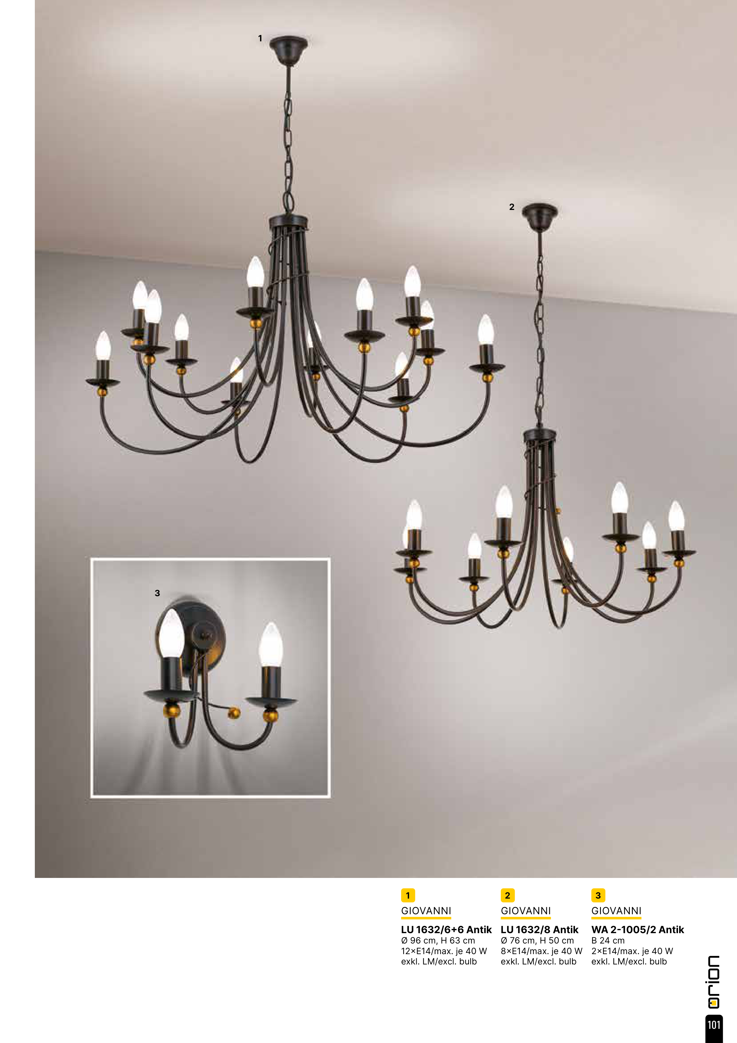 1 2 3 1 GIOVANNI LU 1632/6+6 Antik Ø 96 cm, H 63 cm 12×E14/max. je 40 W exkl. LM/excl. bulb 2 GIOVANNI LU 1632/8 Antik Ø 76 cm, H 50 cm 8×E14/max. je 40 W exkl. LM/excl. bulb 3 GIOVANNI WA 2-1005/2 Antik B 24 cm 2×E14/max. je 40 W exkl. LM/excl. bulb 101