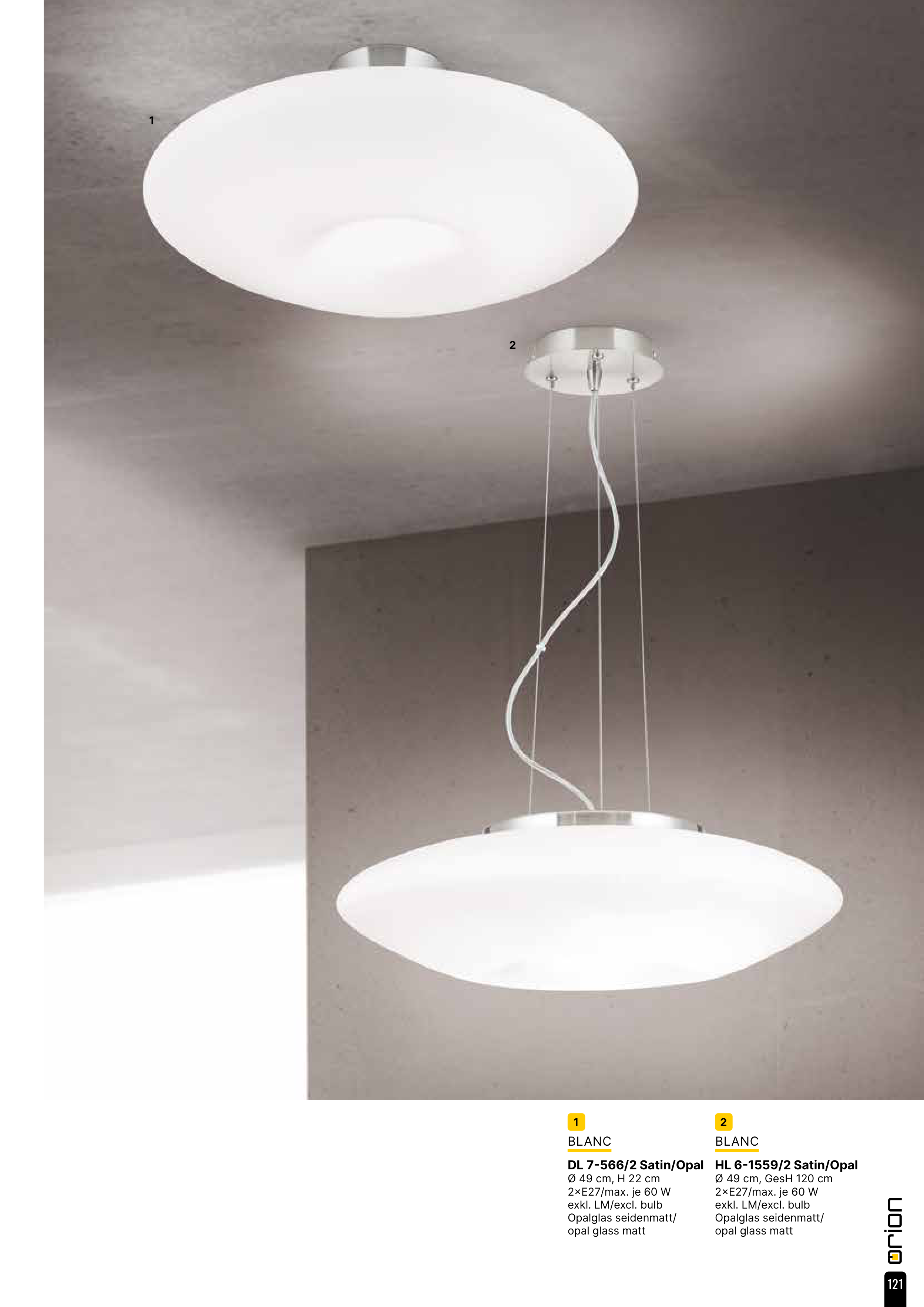 2 BLANC HL 6-1559/2 Satin/Opal Ø 49 cm, GesH 120 cm 2×E27/max. je 60 W exkl. LM/excl. bulb Opalglas seidenmatt/ opal glass matt 1 BLANC DL 7-566/2 Satin/Opal Ø 49 cm, H 22 cm 2×E27/max. je 60 W exkl. LM/excl. bulb Opalglas seidenmatt/ opal glass matt 1 2 121