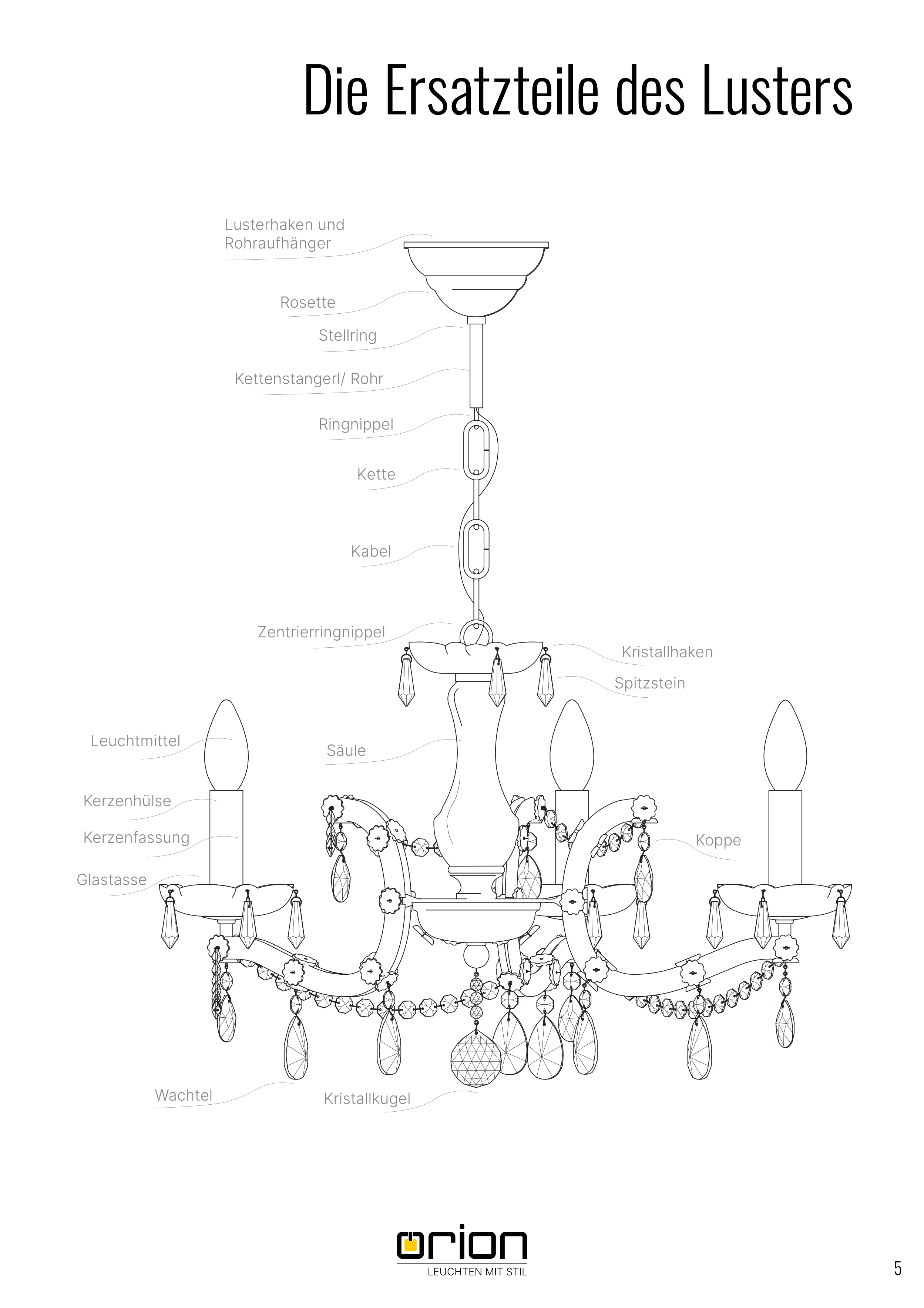 Kristallkugel Wachtel Kristallhaken Koppe Spitzstein Glastasse Kerzenfassung Kerzenhülse Leuchtmittel Säule Zentrierringnippel Ka b e l K e tte Ringnippel Kettenstangerl/ Rohr Stellring Rosette Lusterhaken und Rohraufhänger a b e l K e tte 5 Die Ersatzteile des Lusters