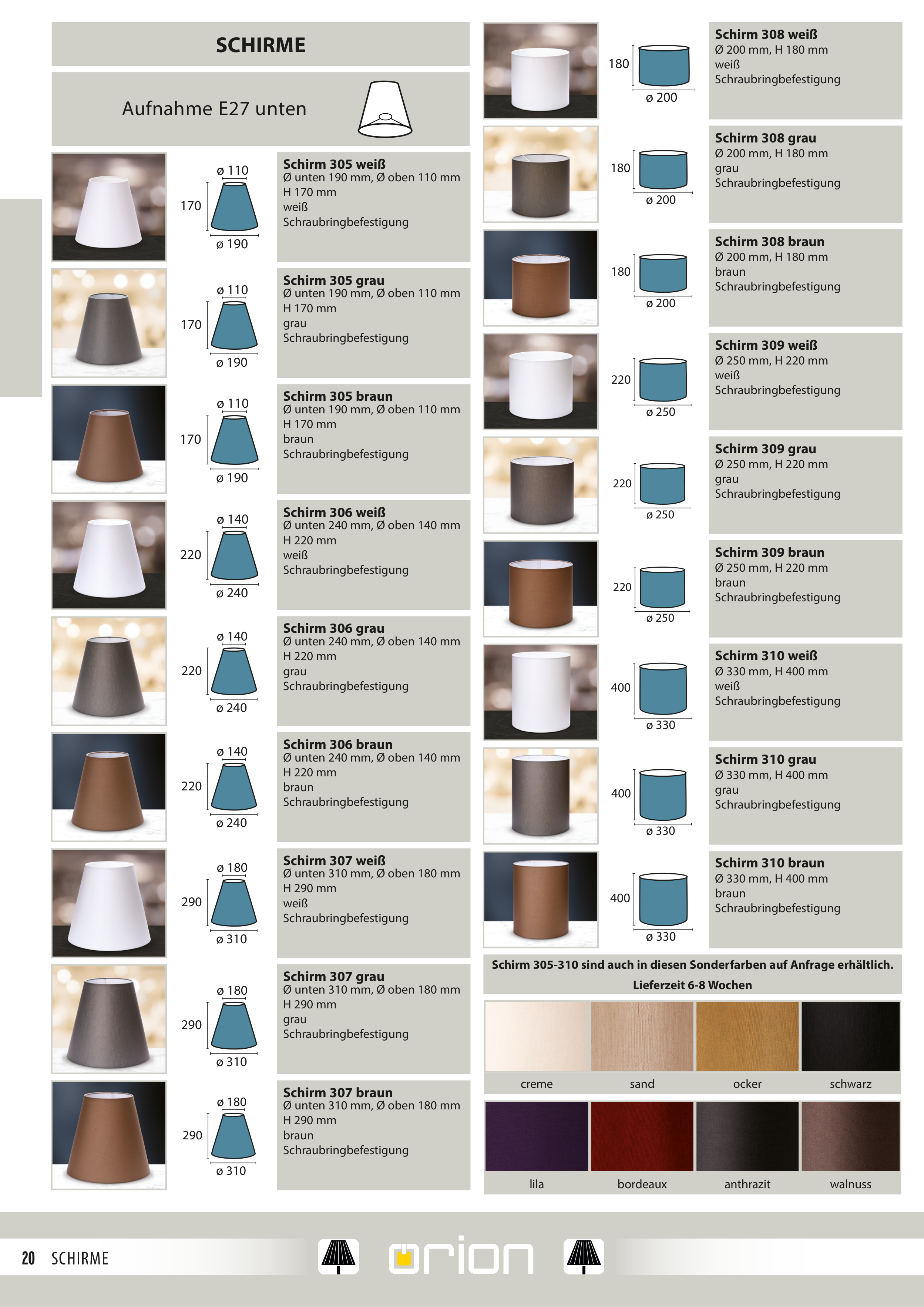 Schirm 305-310 sind auch in diesen Sonderfarben auf Anfrage erhältlich.