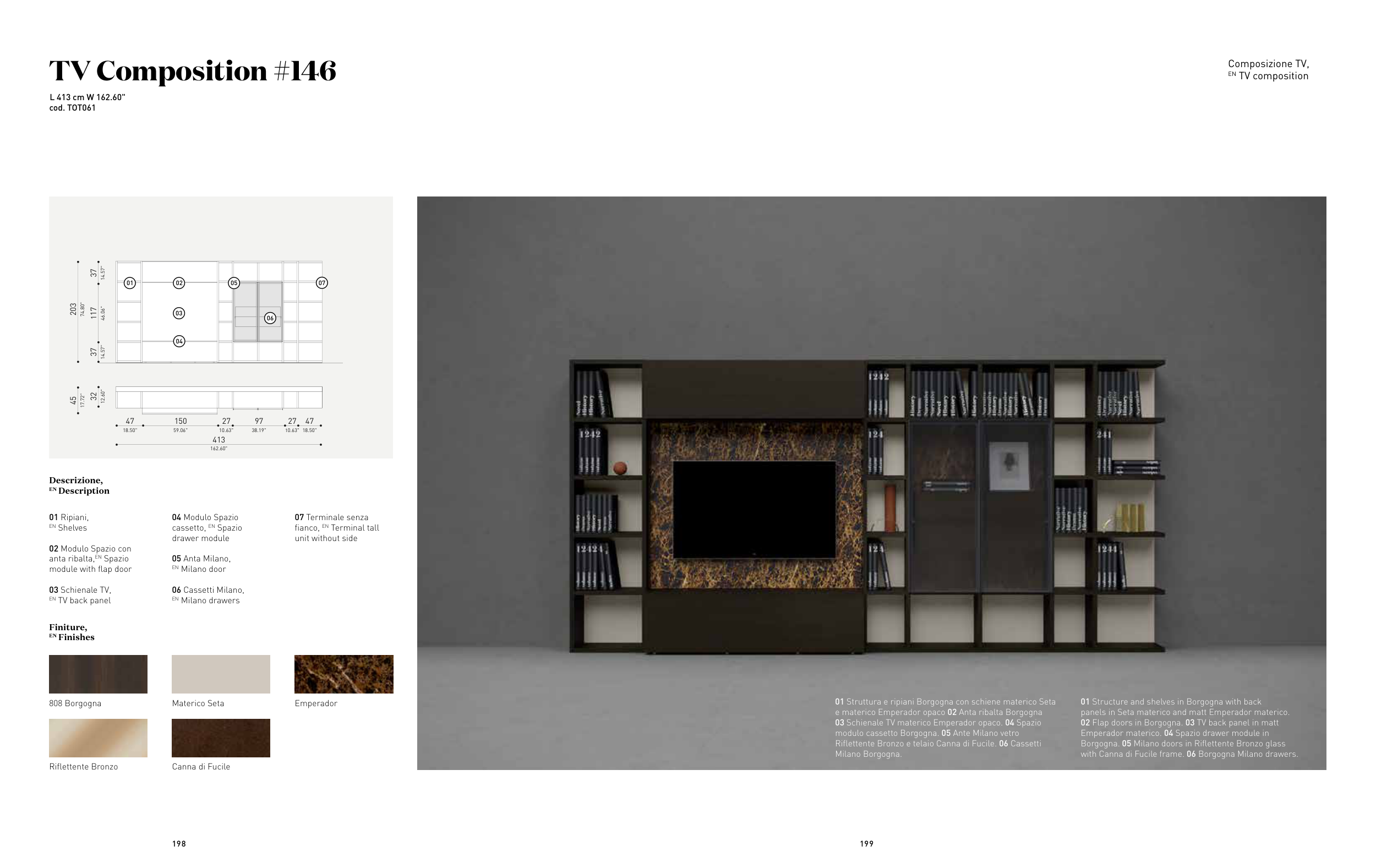 02 Flap doors in Borgogna. 03 TV back panel in matt