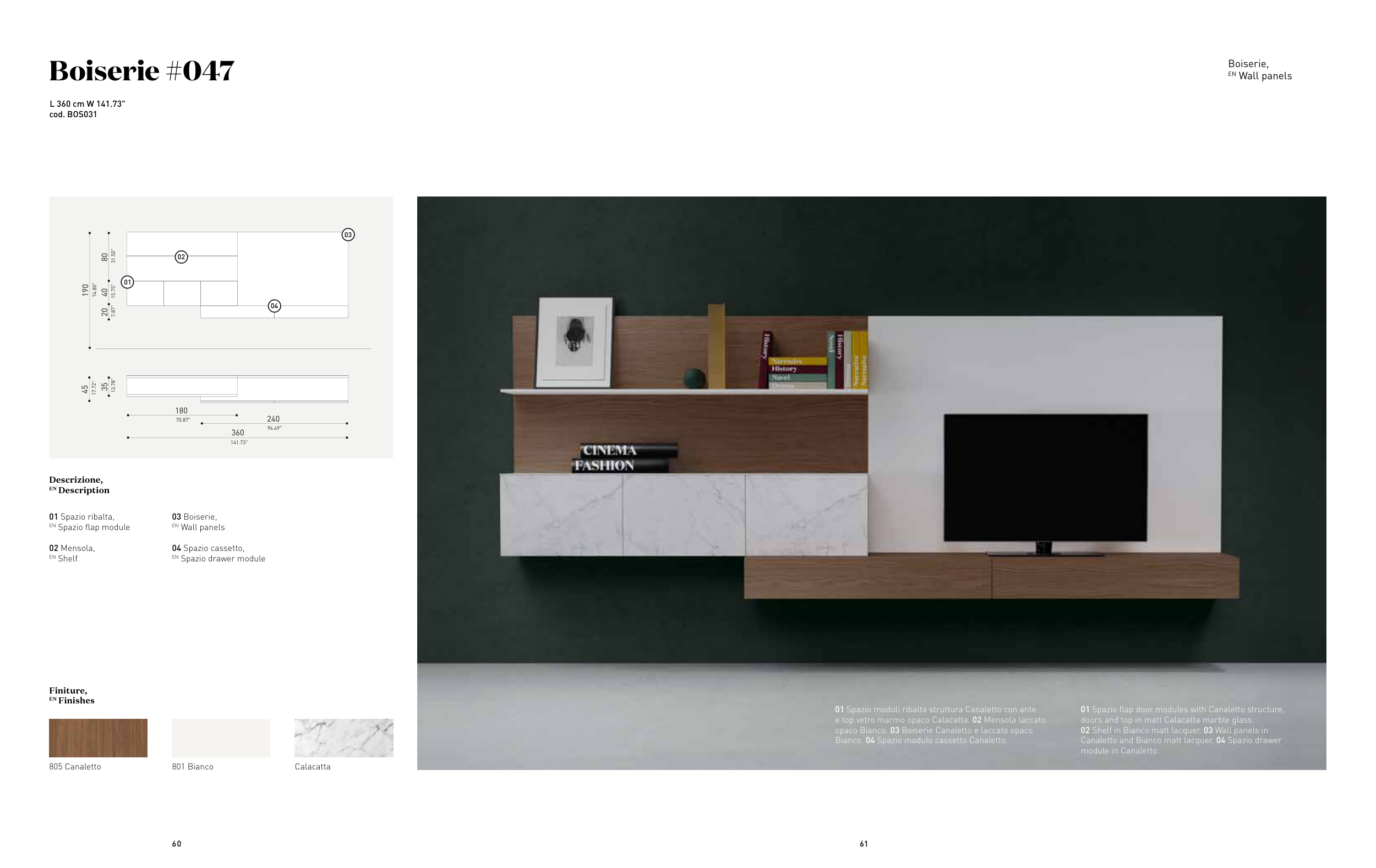 02 Shelf in Bianco matt lacquer. 03 Wall panels in