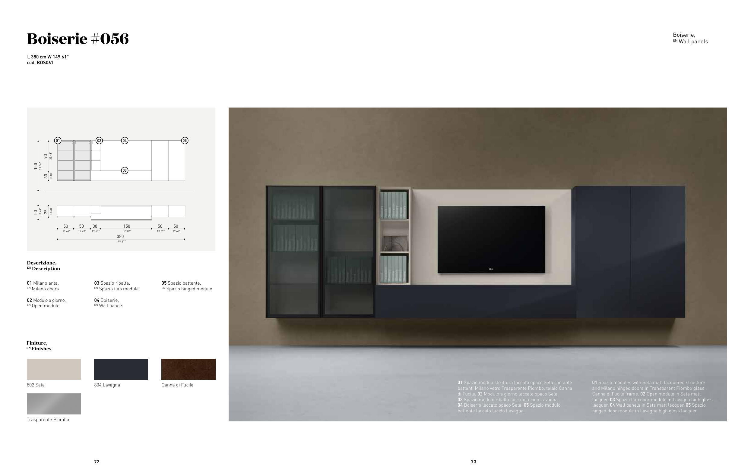 lacquer. 04 Wall panels in Seta matt lacquer. 05 Spazio