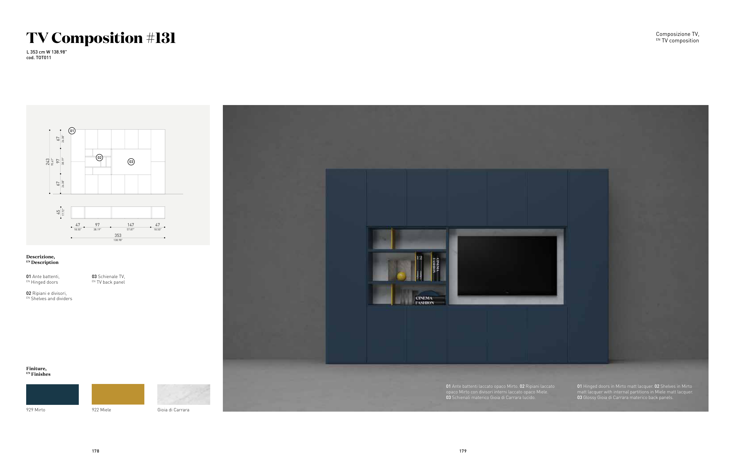 01 Hinged doors in Mirto matt lacquer. 02 Shelves in Mirto
