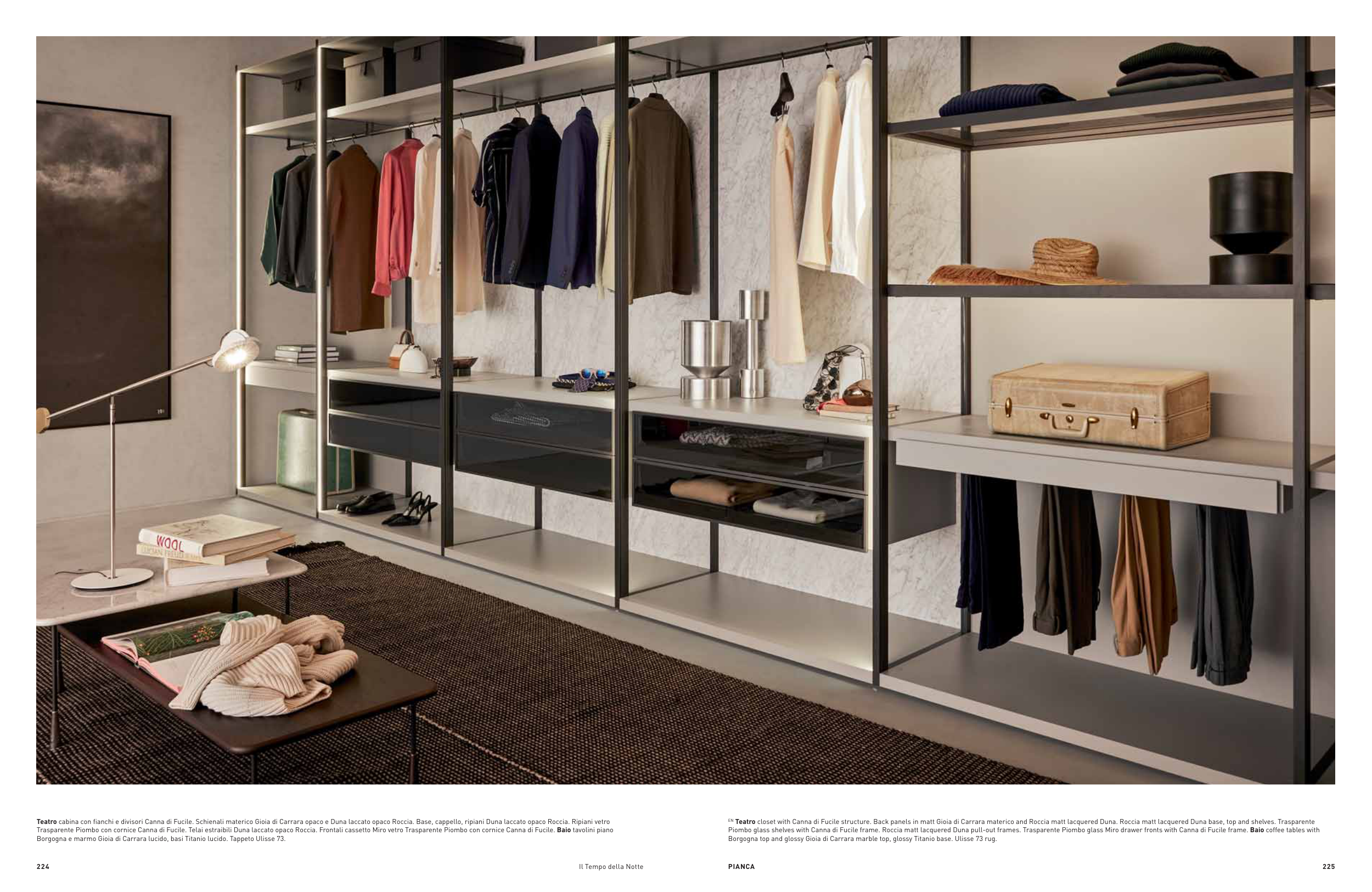 EN Teatro closet with Canna di Fucile structure. Back panels in matt Gioia di Carrara materico and Roccia matt lacquered Duna. Roccia matt lacquered Duna base, top and shelves. Trasparente