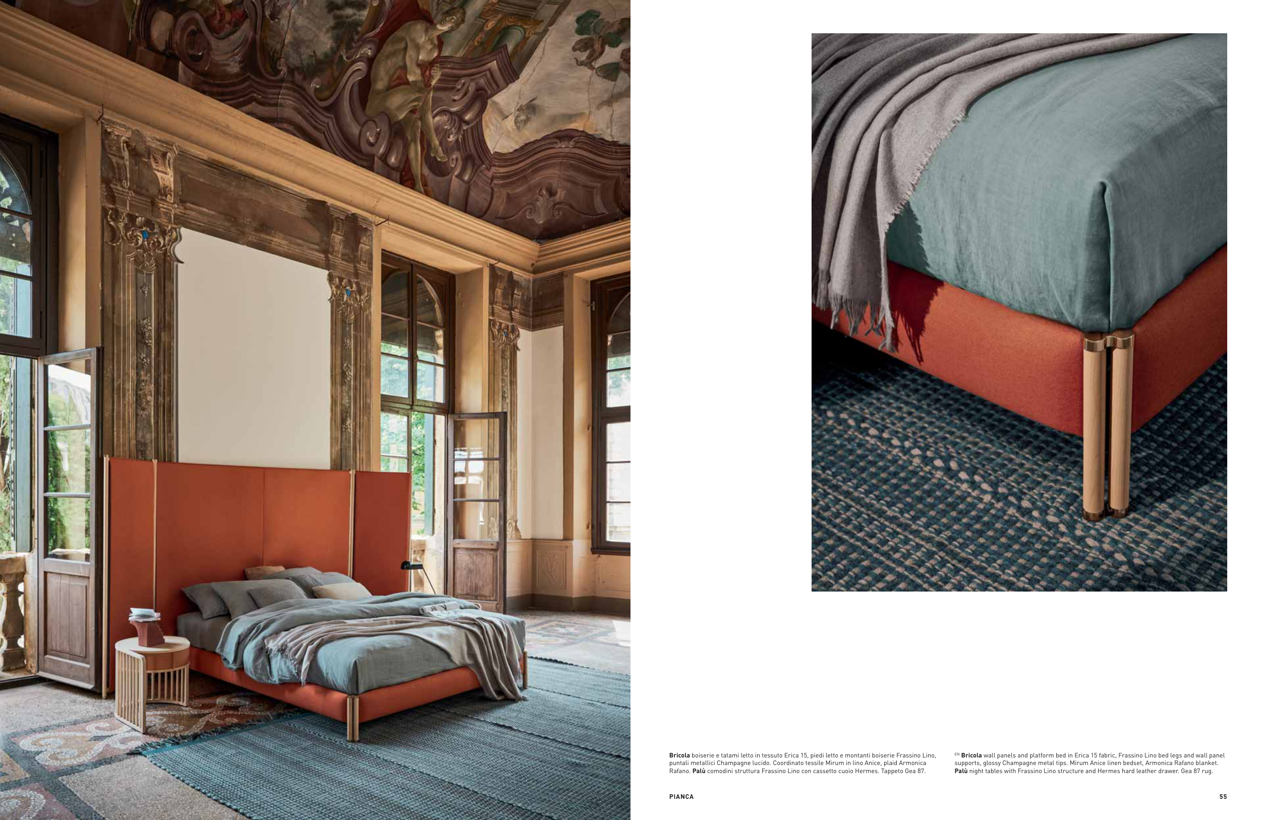 EN Bricola wall panels and platform bed in Erica 15 fabric, Frassino Lino bed legs and wall panel