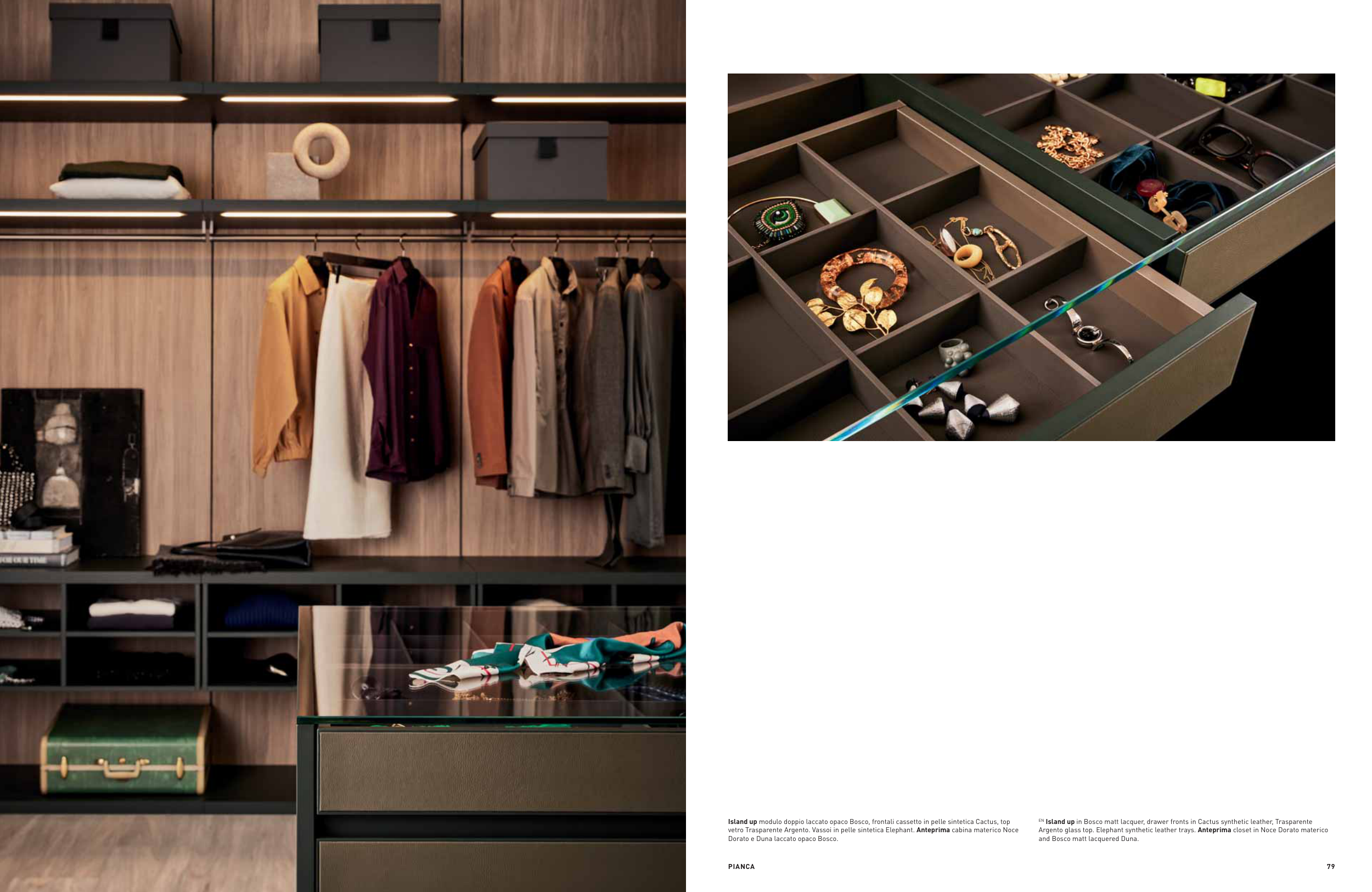 Argento glass top. Elephant synthetic leather trays. Anteprima closet in Noce Dorato materico