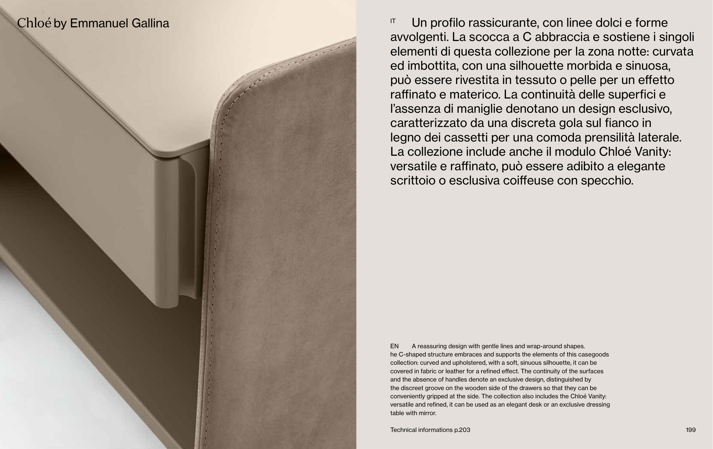 covered in fabric or leather for a refined effect. The continuity of the surfaces