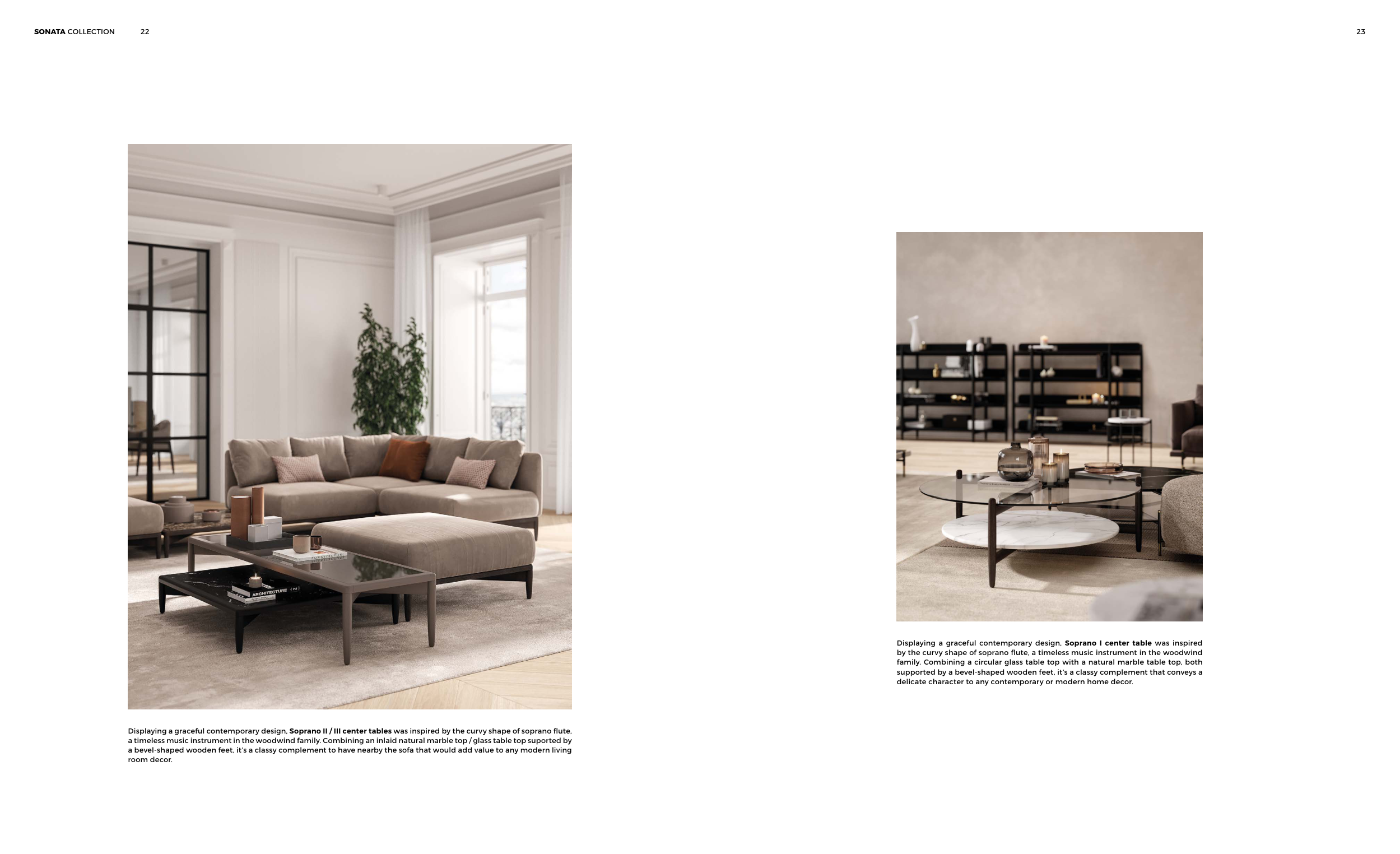 Displaying a graceful contemporary design, Soprano II / III center tables was inspired by the curvy shape of soprano flute,