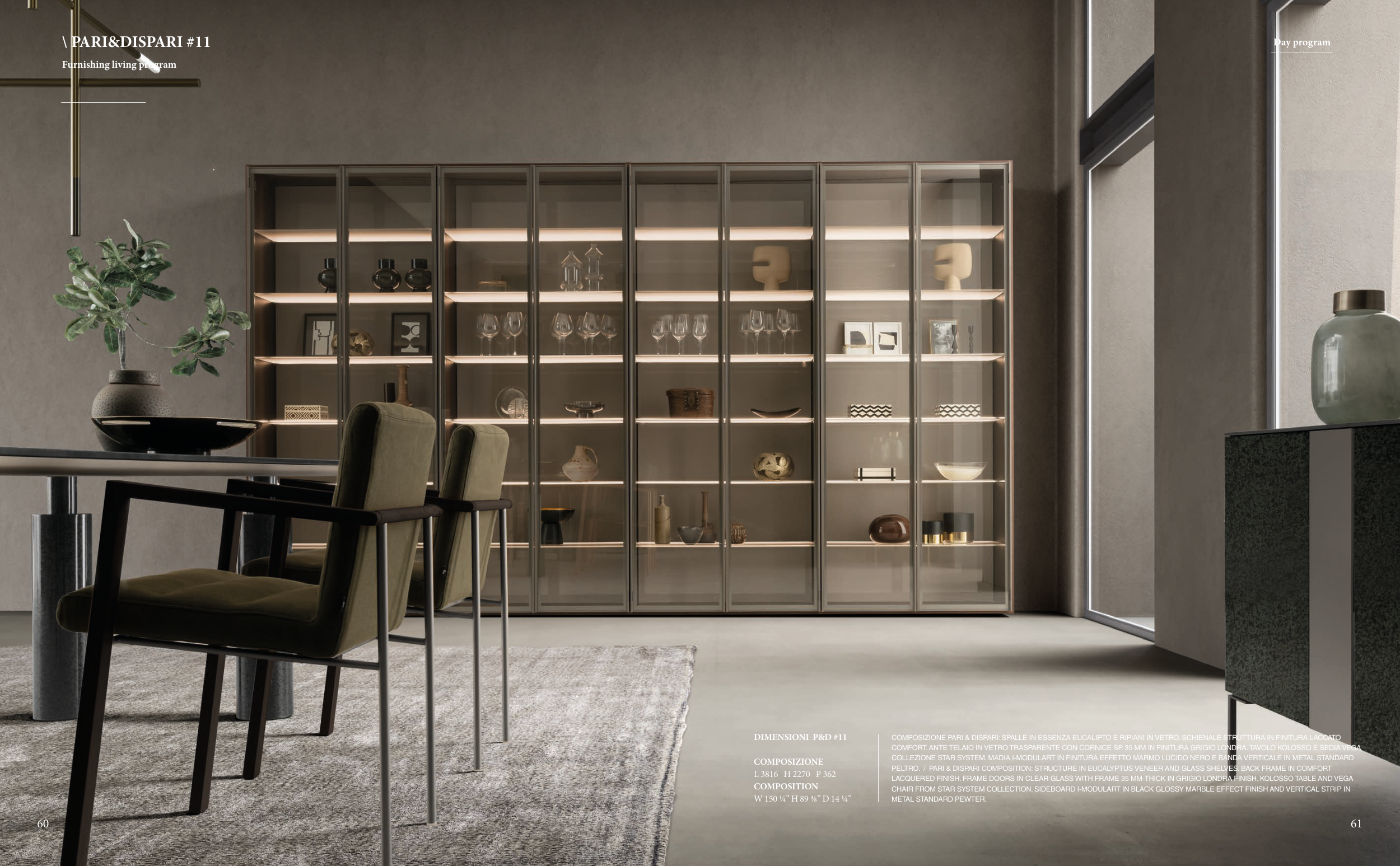 LACQUERED FINISH. FRAME DOORS IN CLEAR GLASS WITH FRAME 35 MM-THICK IN GRIGIO LONDRA FINISH. KOLOSSO TABLE AND VEGA