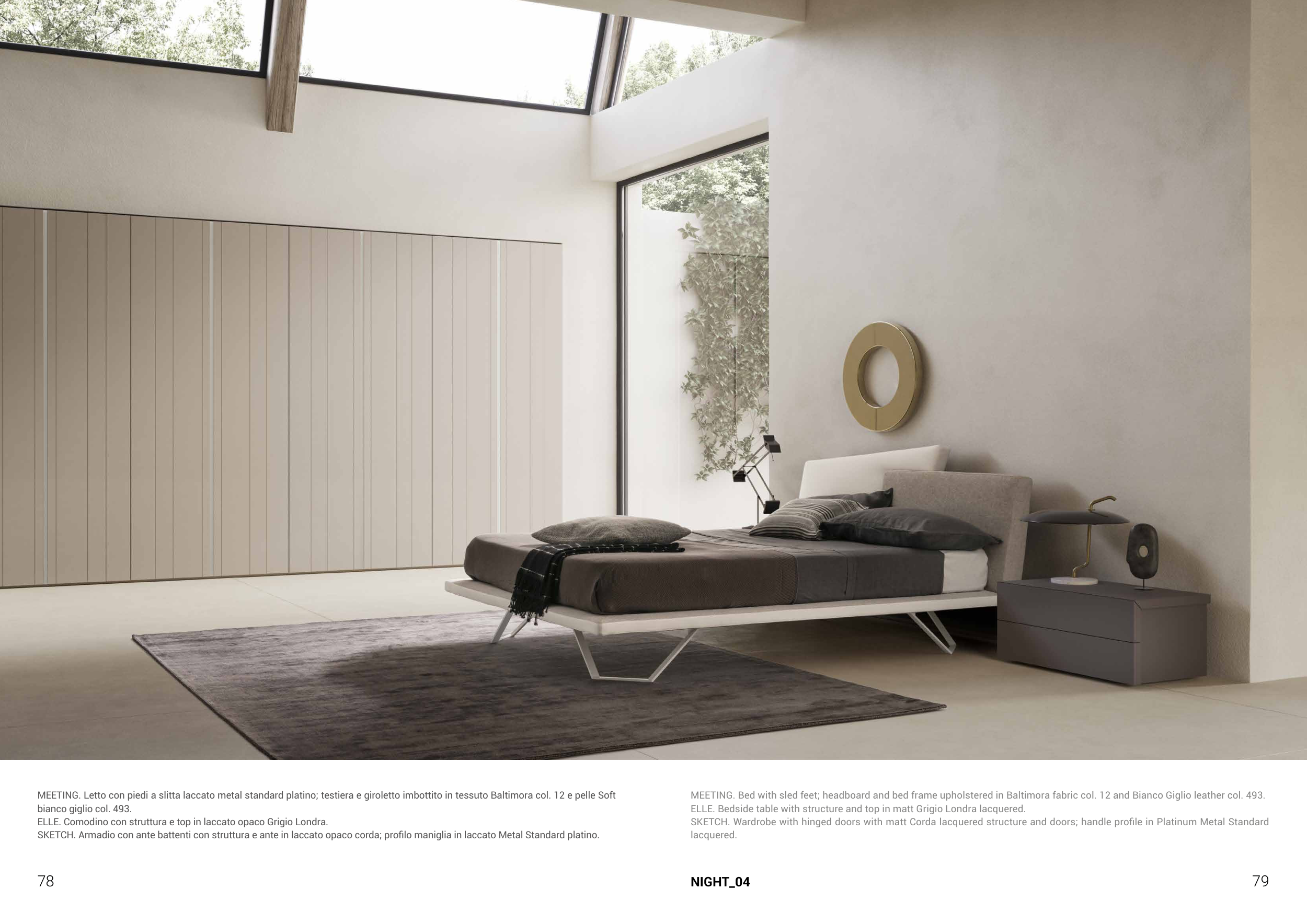 MEETING. Letto con piedi a slitta laccato metal standard platino; testiera e giroletto imbottito in tessuto Baltimora col. 12 e pelle Soft