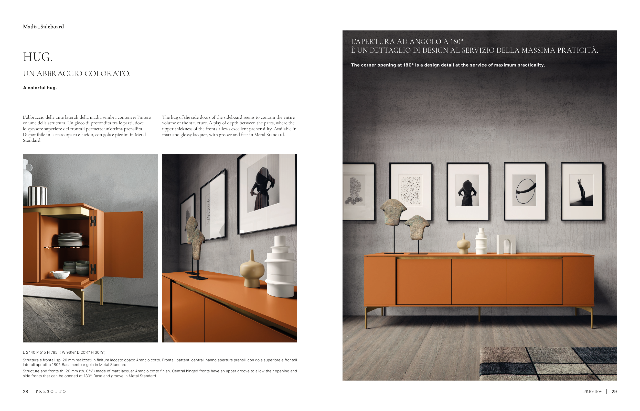 Structure and fronts th. 20 mm (th. 03/4”) made of matt lacquer Arancio cotto finish. Central hinged fronts have an upper groove to allow their opening and