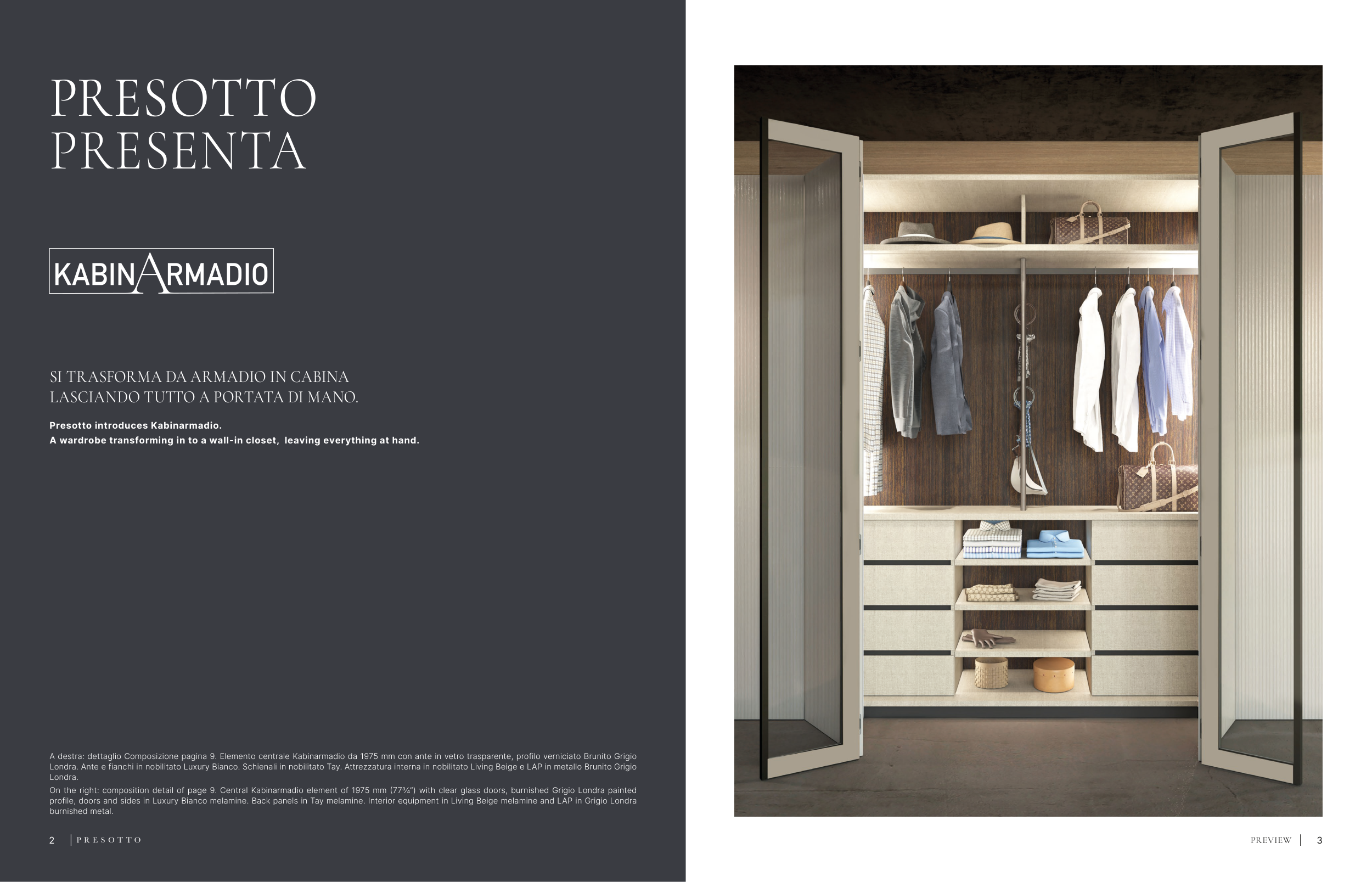 On the right: composition detail of page 9. Central Kabinarmadio element of 1975 mm (773/4”) with clear glass doors, burnished Grigio Londra painted