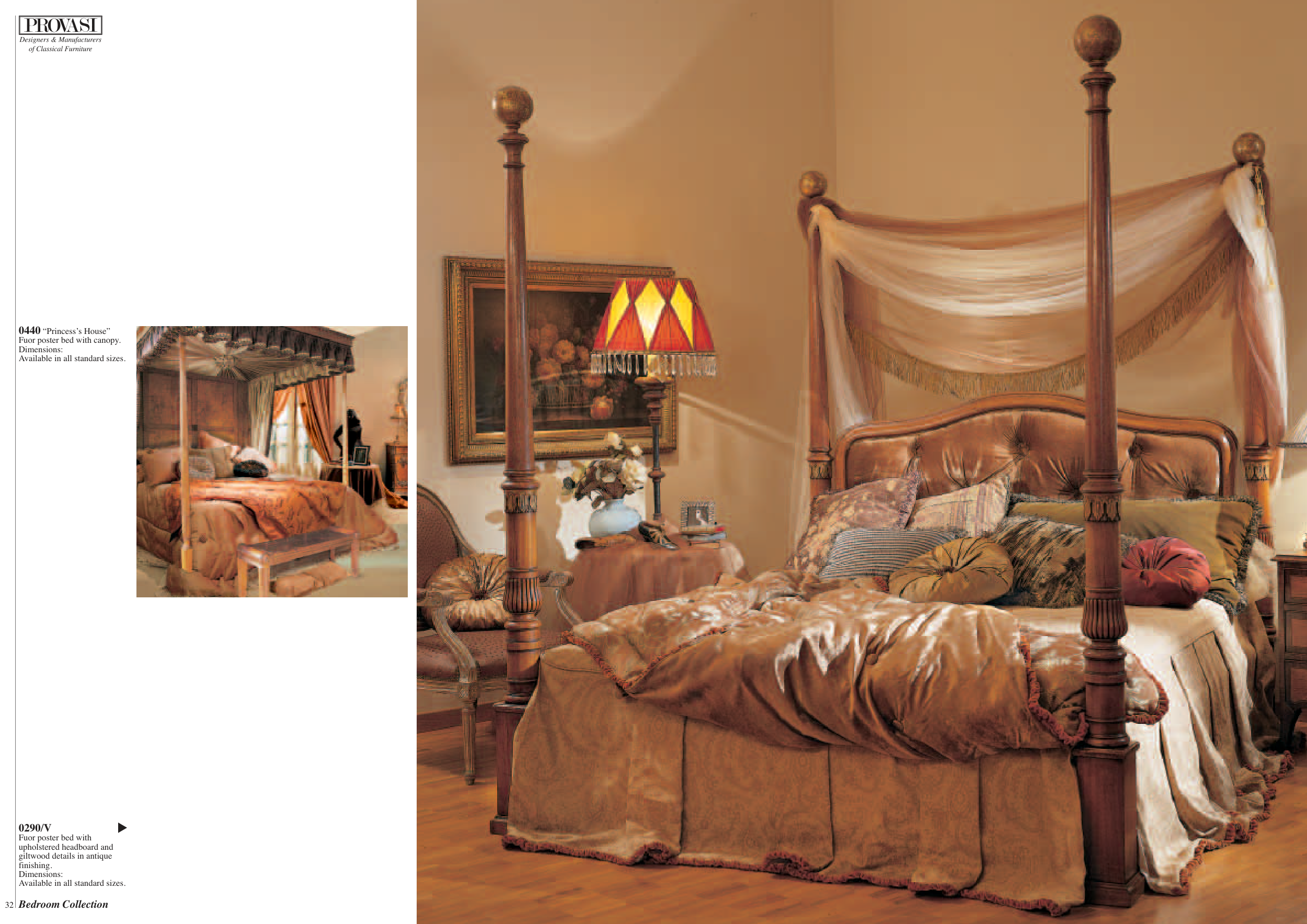 33 32 Bedroom Collection 0440 “Princess’s House” Fuor poster bed with canopy. Dimensions: Available in all standard sizes. 0290/V Fuor poster bed with upholstered headboard and giltwood details in antique finishing. Dimensions: Available in all standard sizes. ▲