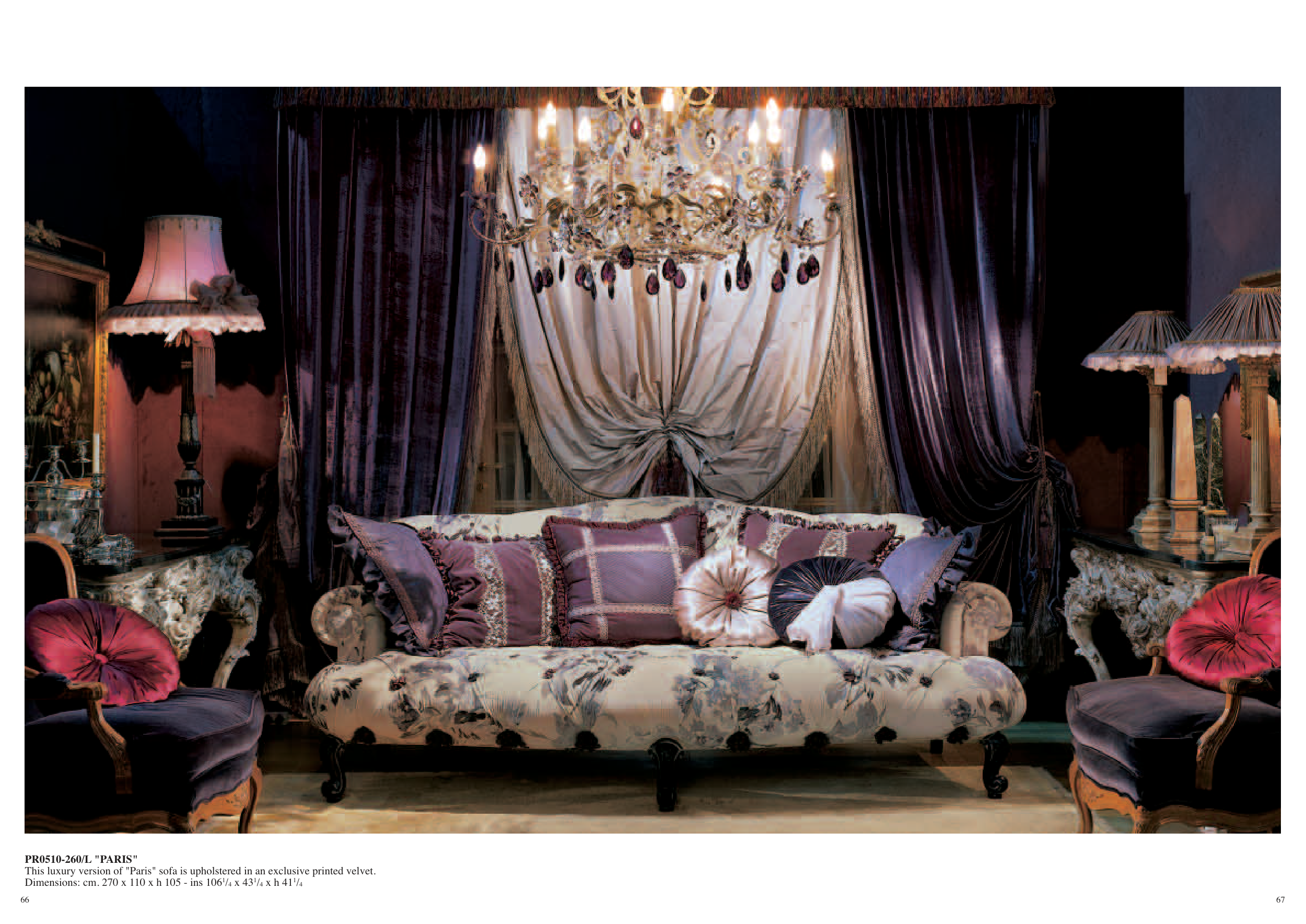 This luxury version of "Paris" sofa is upholstered in an exclusive printed velvet.