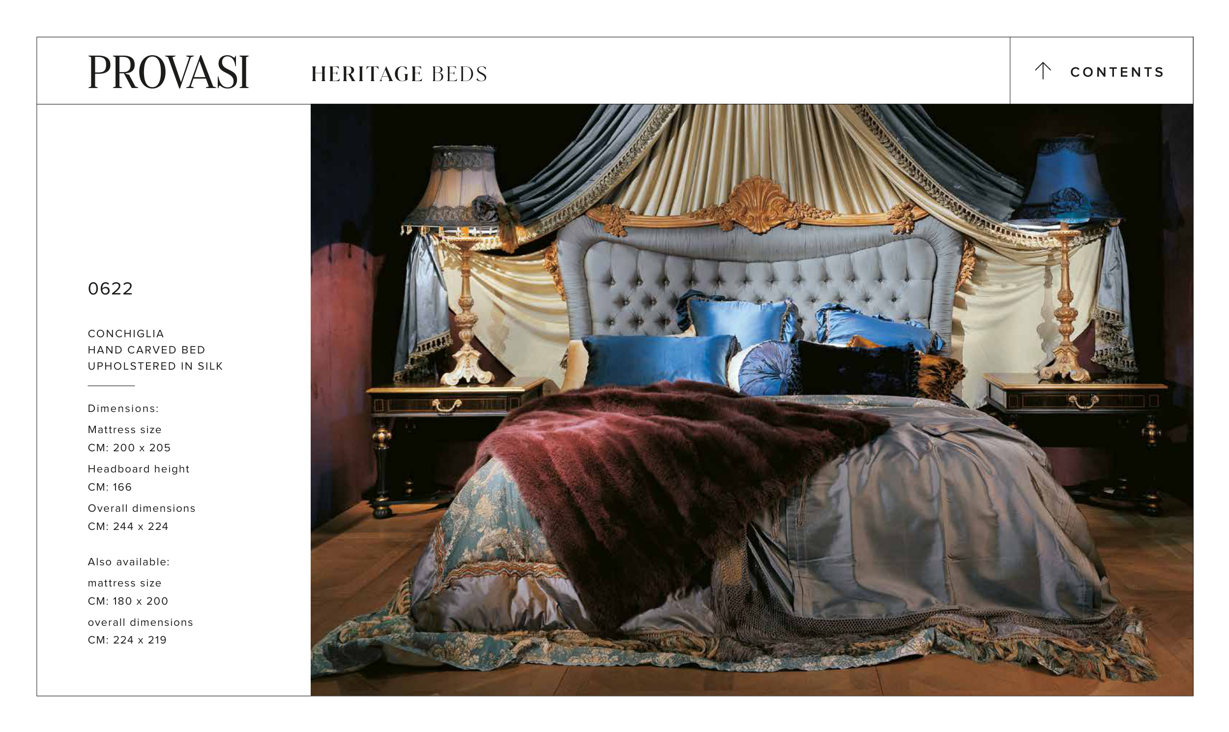 0622 CONCHIGLIA HAND CARVED BED UPHOLSTERED IN SILK Dimensions: Mattress size CM: 200 x 205 Headboard height CM: 166 Overall dimensions CM: 244 x 224 Also available: mattress size CM: 180 x 200 overall dimensions CM: 224 x 219 C O N T E N T S > HERITAGE BEDS