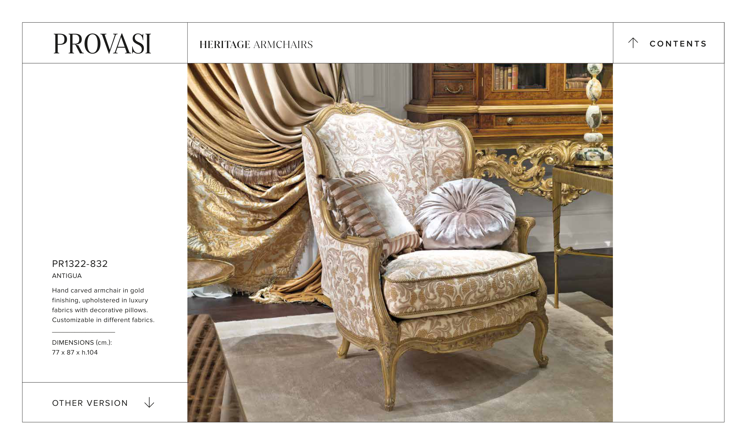 PR1322-832 ANTIGUA Hand carved armchair in gold finishing, upholstered in luxury fabrics with decorative pillows. Customizable in different fabrics. _________________ DIMENSIONS (cm.): 77 x 87 x h.104 OTHER VERSION > C O N T E N T S > HERITAGE ARMCHAIRS