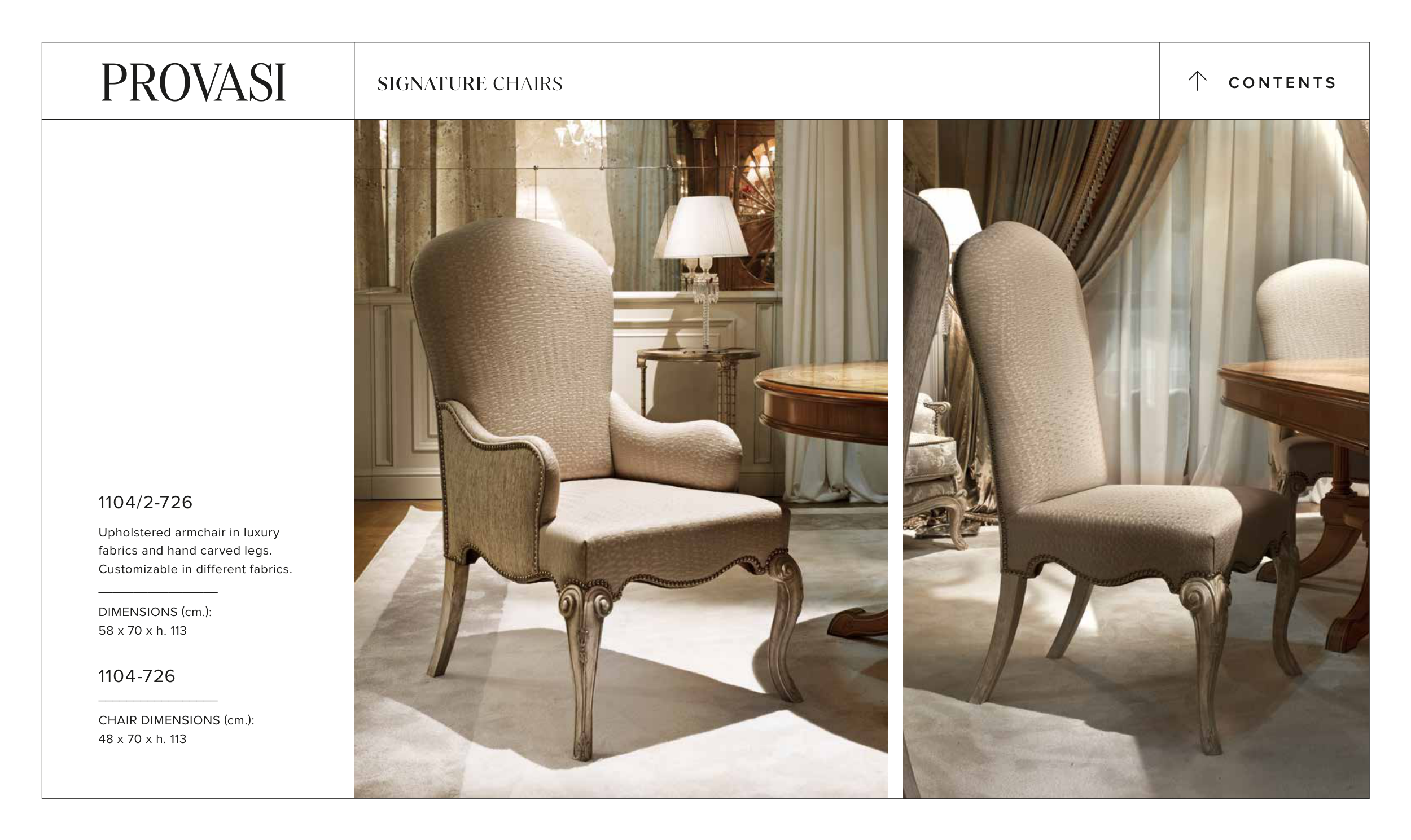 1104/2-726 Upholstered armchair in luxury fabrics and hand carved legs. Customizable in different fabrics. _________________ DIMENSIONS (cm.): 58 x 70 x h. 113 1104-726 _________________ CHAIR DIMENSIONS (cm.): 48 x 70 x h. 113 C O N T E N T S > SIGNATURE CHAIRS