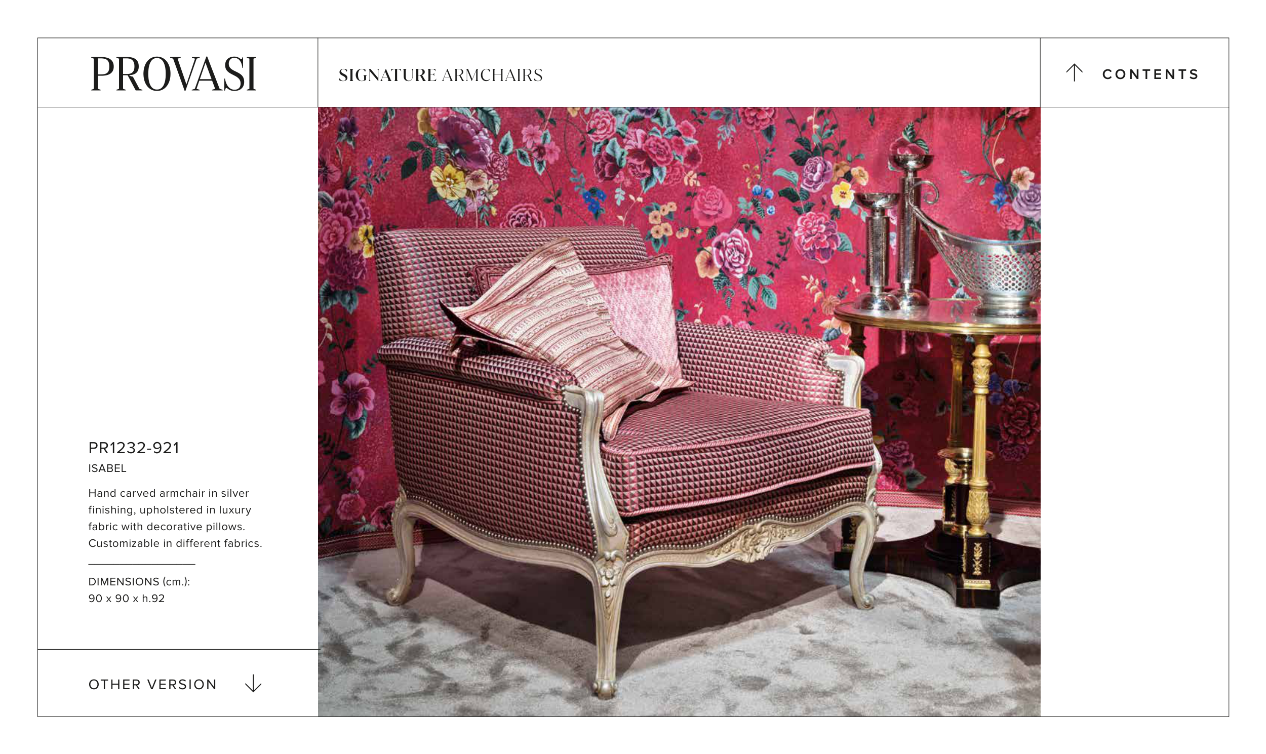 PR1232-921 ISABEL Hand carved armchair in silver finishing, upholstered in luxury fabric with decorative pillows. Customizable in different fabrics. _________________ DIMENSIONS (cm.): 90 x 90 x h.92 OTHER VERSION > C O N T E N T S > SIGNATURE ARMCHAIRS