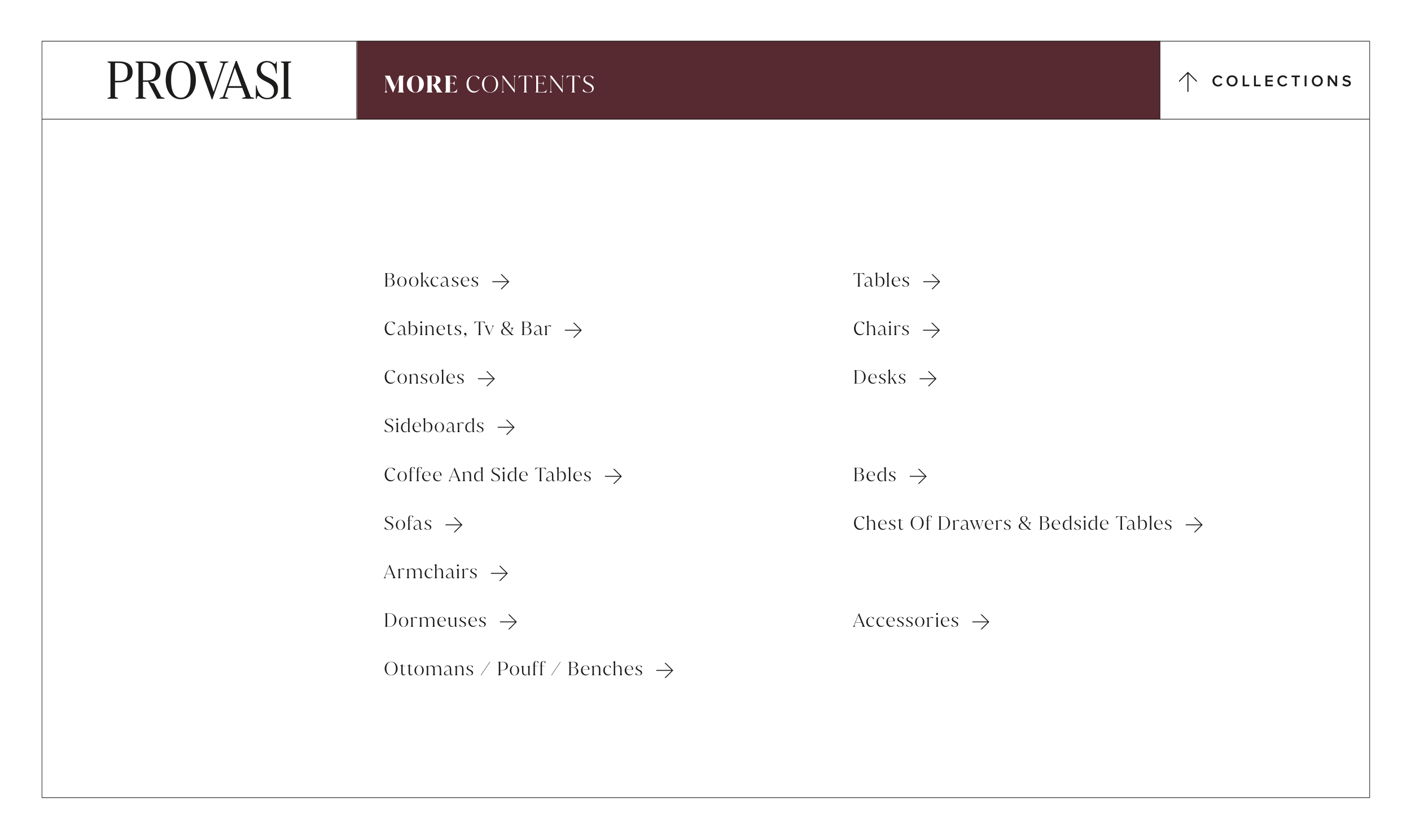 C O L L E C T I O N S > Bookcases > Cabinets, Tv & Bar > Consoles > Sideboards > Coffee And Side Tables > Sofas > Armchairs > Dormeuses > Ottomans / Pouff / Benches > Tables > Chairs > Desks > Beds > Chest Of Drawers & Bedside Tables > Accessories > MORE CONTENTS