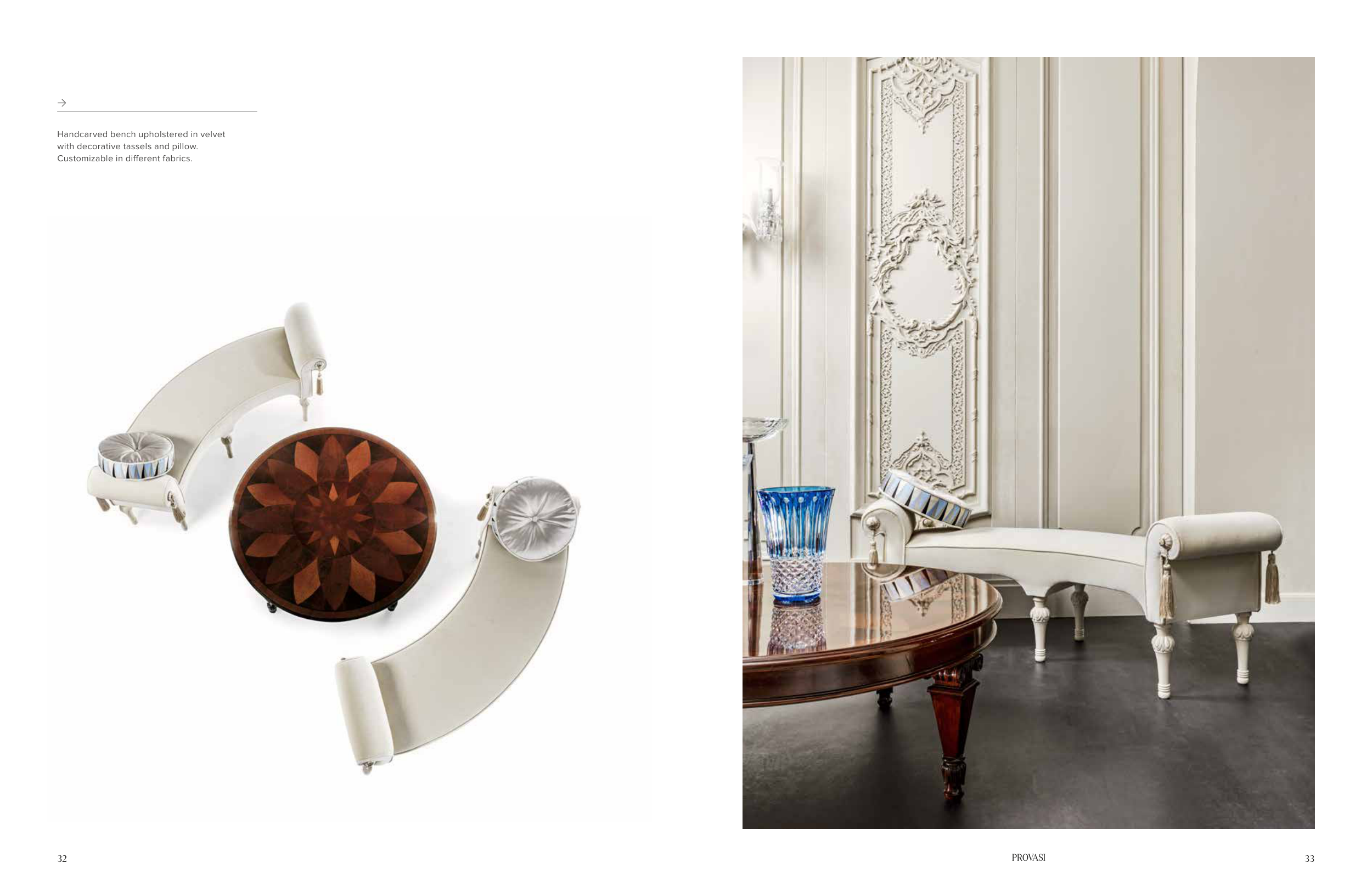 Handcarved bench upholstered in velvet