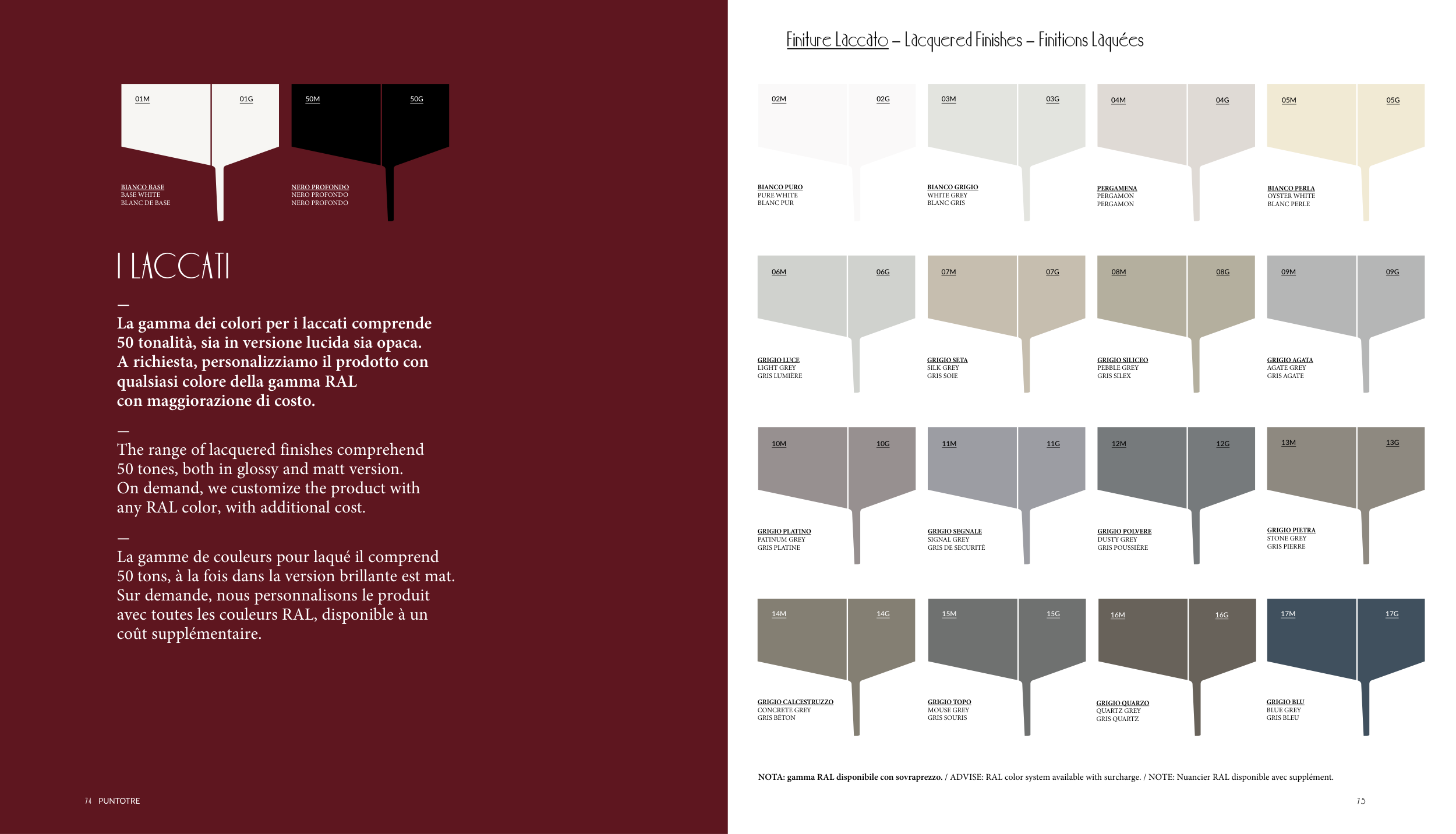 NOTA: gamma RAL disponibile con sovraprezzo. / ADVISE: RAL color system available with surcharge. / NOTE: Nuancier RAL disponible avec supplément.